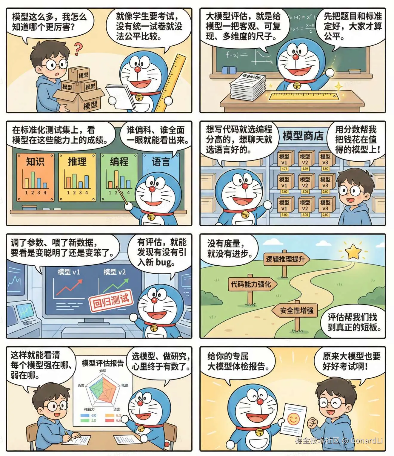 想象一下,如果没有标准化的考试,我们怎么知道一个学生学得怎么样?是让他即兴来一段 freestyle,还是解一道老师自己都可能做错的奥数题?这两种方式都有用,但都不够全面和公平。大模型的评估也是一个道理。