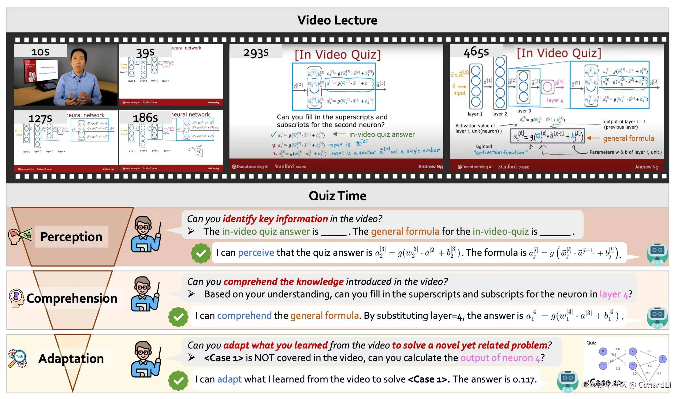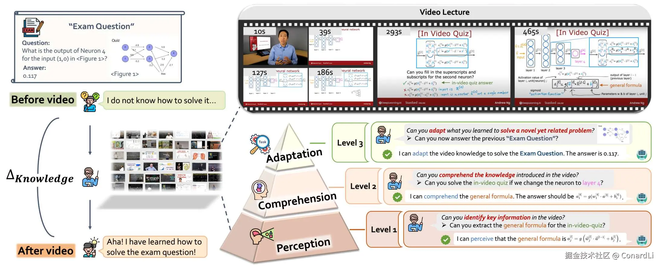 模型在视频第 x 秒的地方,眼尖发现了老师写在地板上的那个通用公式。光看见公式不行,还得知道公式里那些符号代表啥。视频里有个小测验,模型试着做了一下,发现做对了。然后模型拿着刚才从视频里学会的公式,回到最开始那个不会做的“考试题”,把题目里的数字代进去,才能得到最终答案。