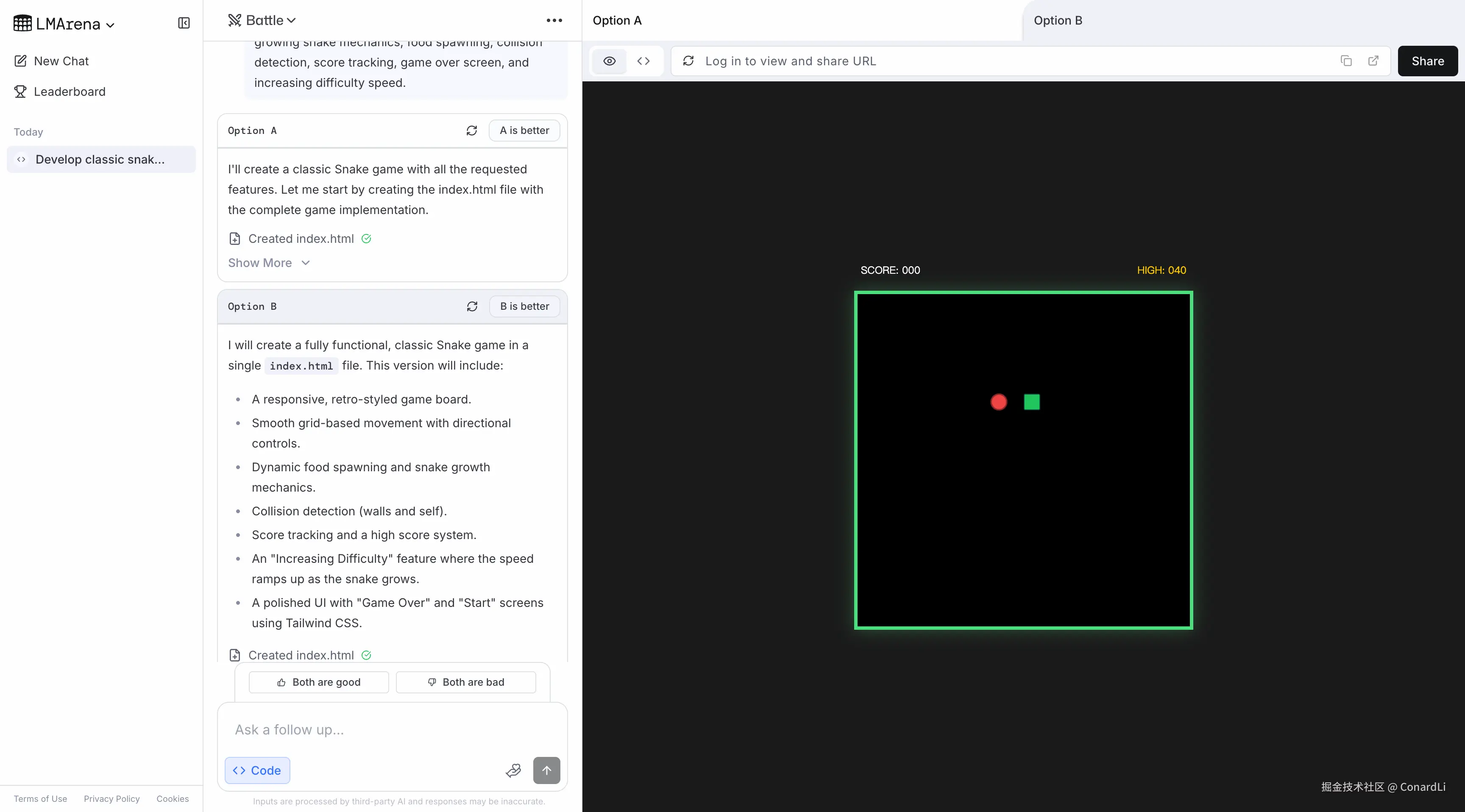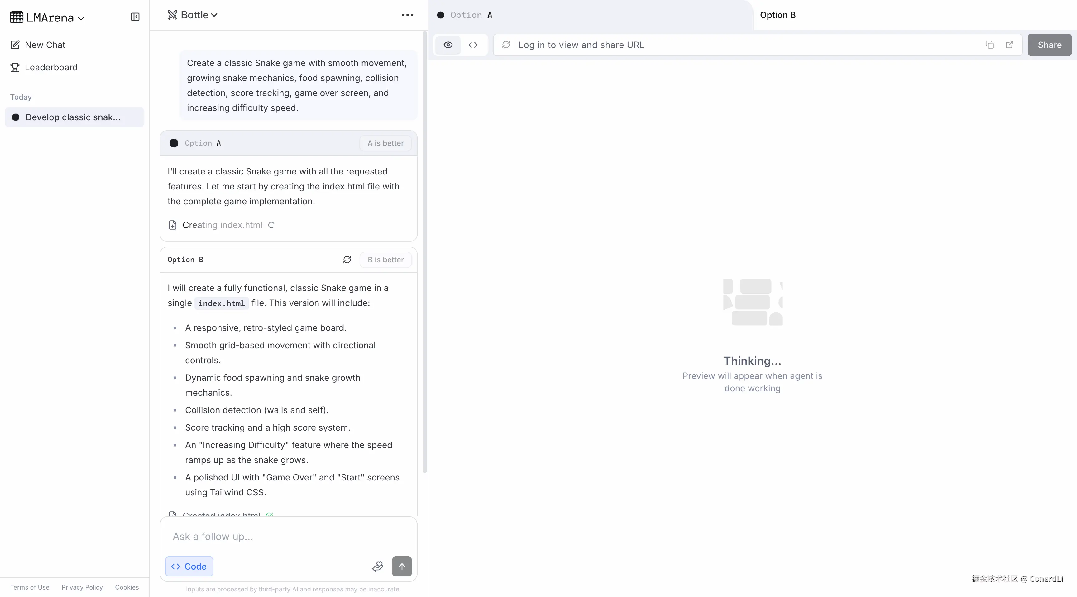 然后系统会随机派两个模型来回答这个问题,此时你完全不知道谁是谁,只显示 A 和 B。