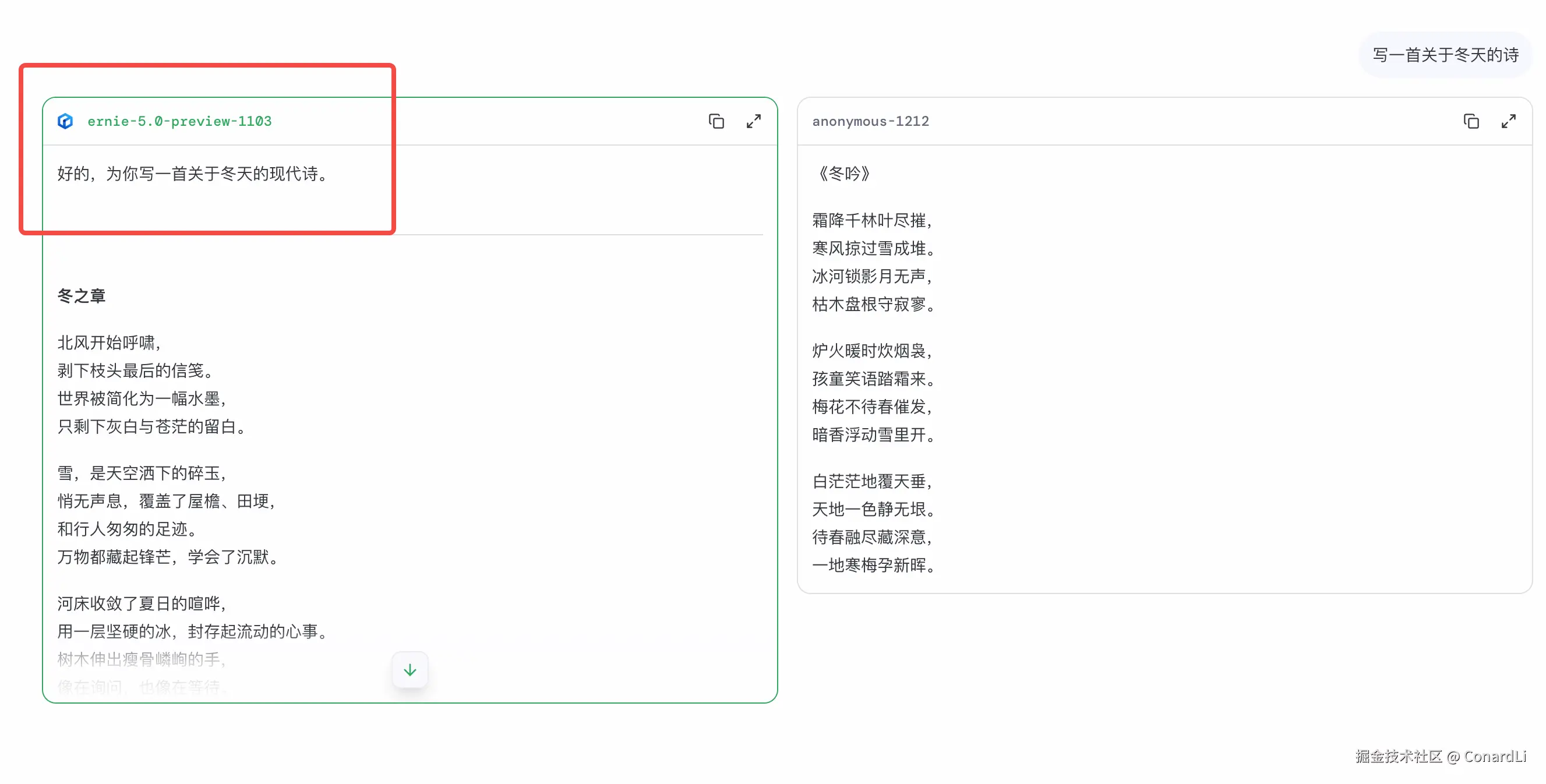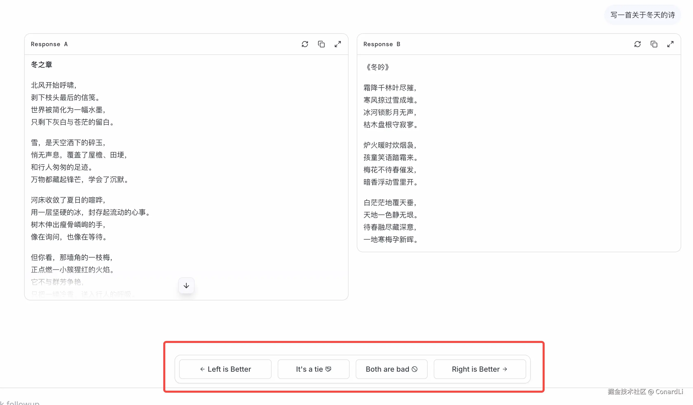 它的机制非常简单粗暴,所有人都可以进入它提供的竞技场,你可以输入任意的问题(比如:写一首关于冬天的诗):