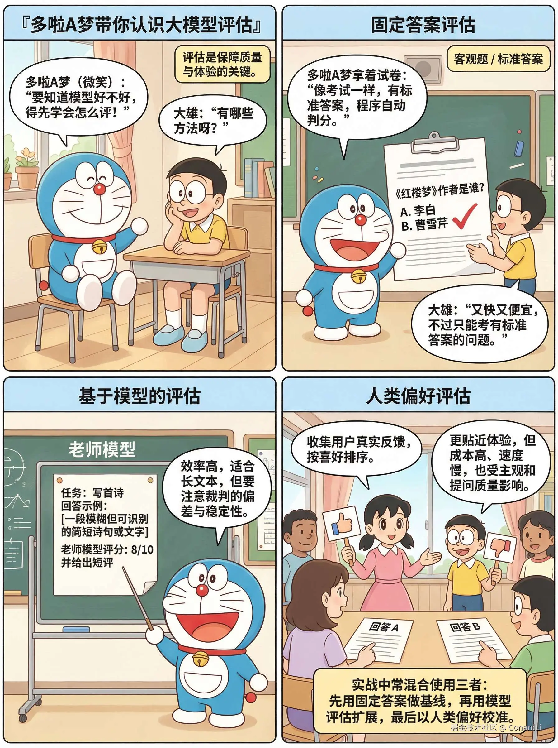 基于模型的评估:让一个能力更强、更受信任的模型作为“裁判”,去评判其他模型的回答质量。比如针对作文题(比如“写首诗”),没有标准答案。然后请一个更强的模型当老师,给小模型的作文打分。虽然有点“套娃”,但这是目前评估长文本效率最高的方法。