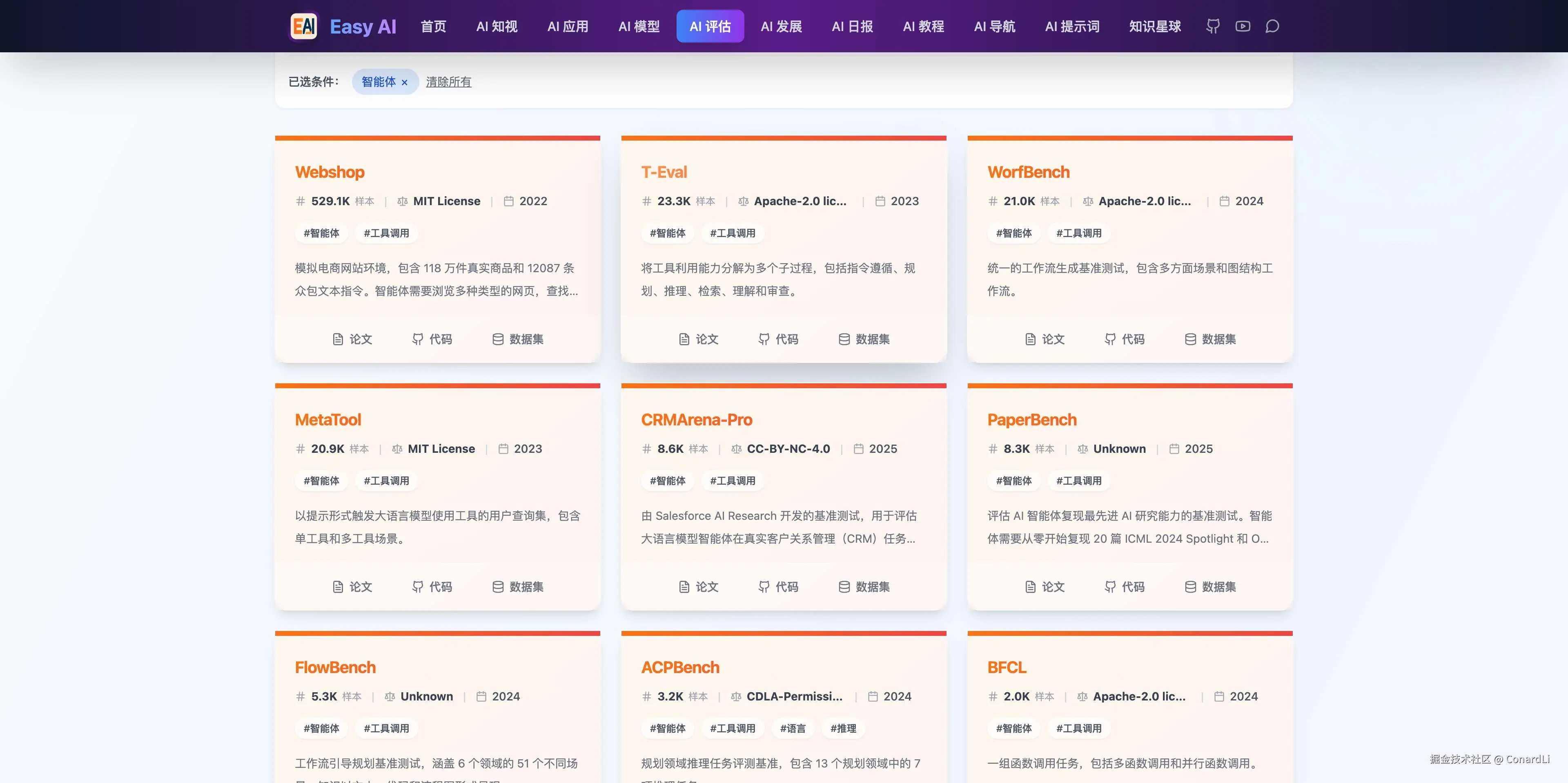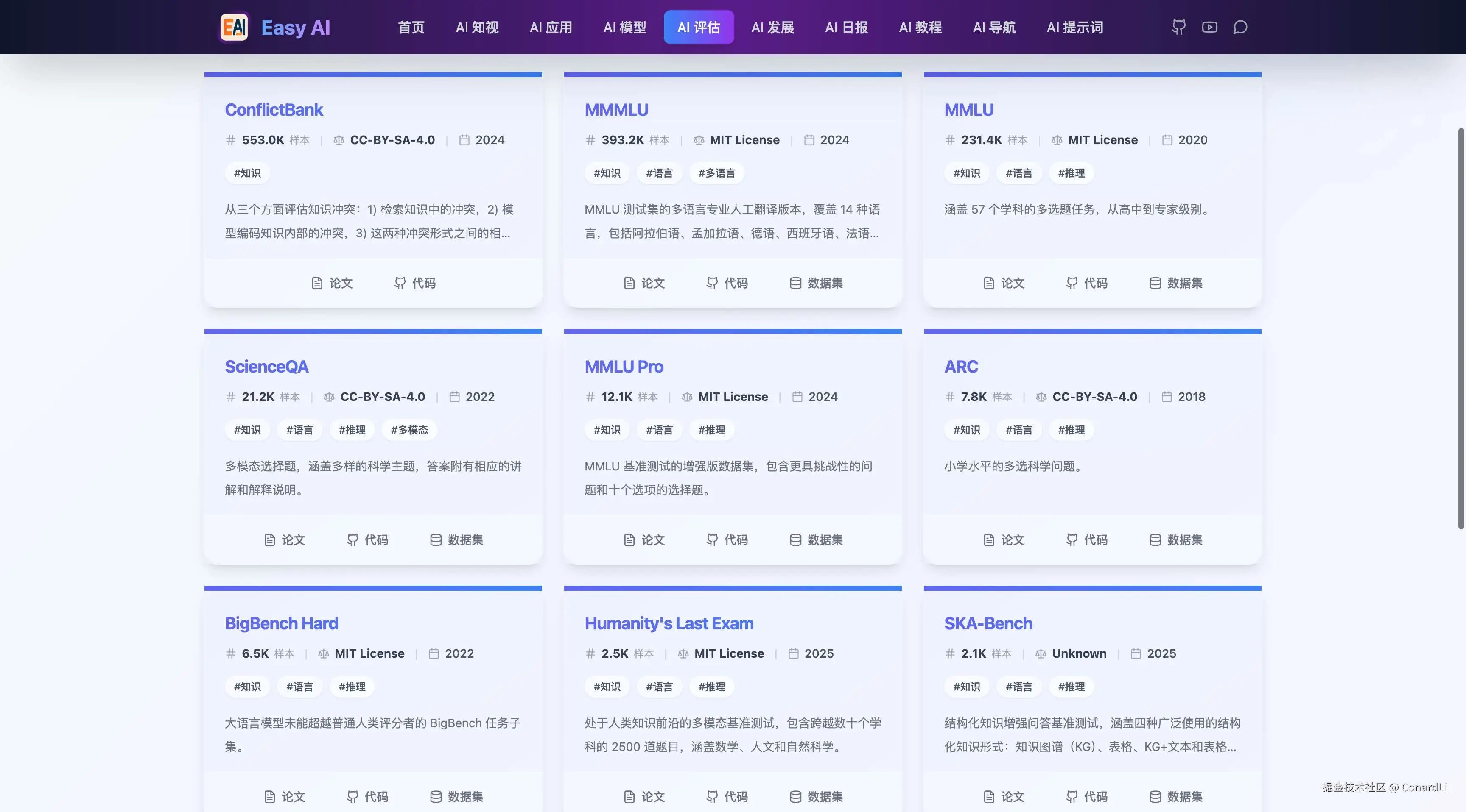 在 Easy AI(https://github.com/ConardLi/easy-learn-ai) 的 AI 评估模块收集了当下最主流的大模型测试基准,每个基准都带有 描述、样本量、协议、论文地址、数据集地址、代码库地址等信息,可以方便大家快速检索到需要某个领域的 LLM 评估基准。