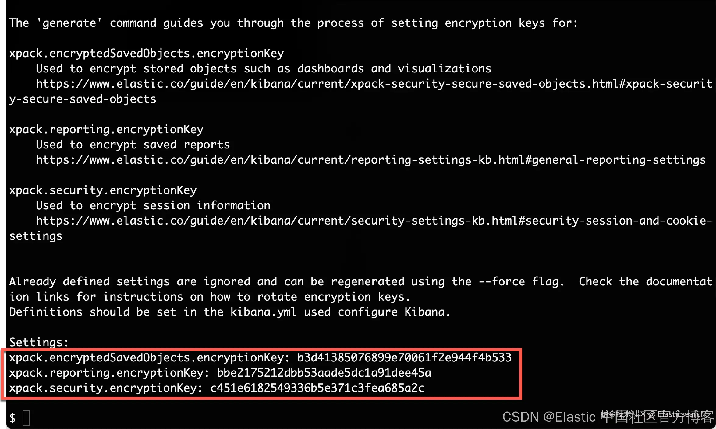 上述命令将生成如上所示的 3 个 keys。我们把上面的三个 keys 拷贝到 config/kibana.yml 文件的最底部,并保存。我们需要重新启动 Kibana。