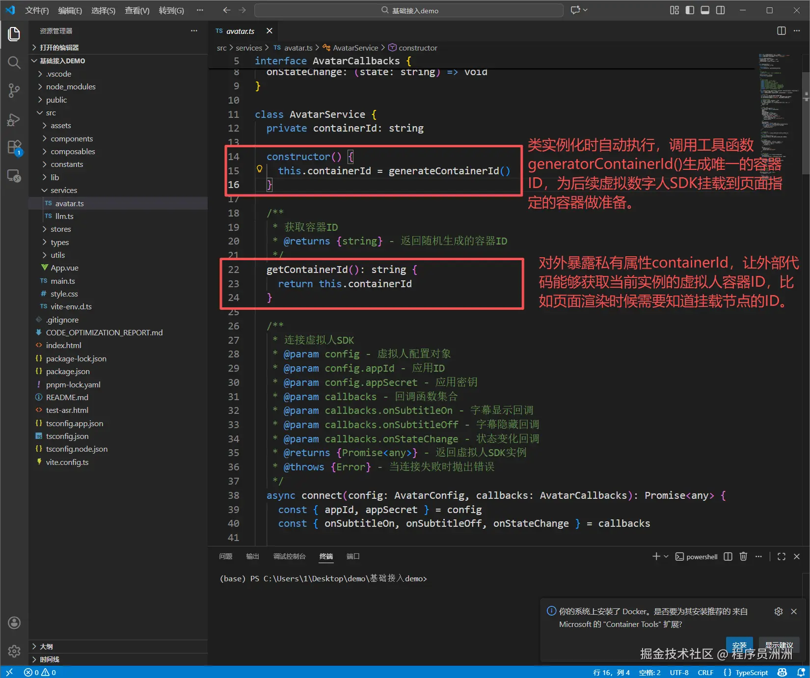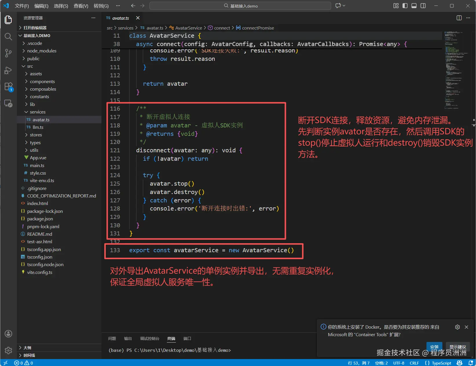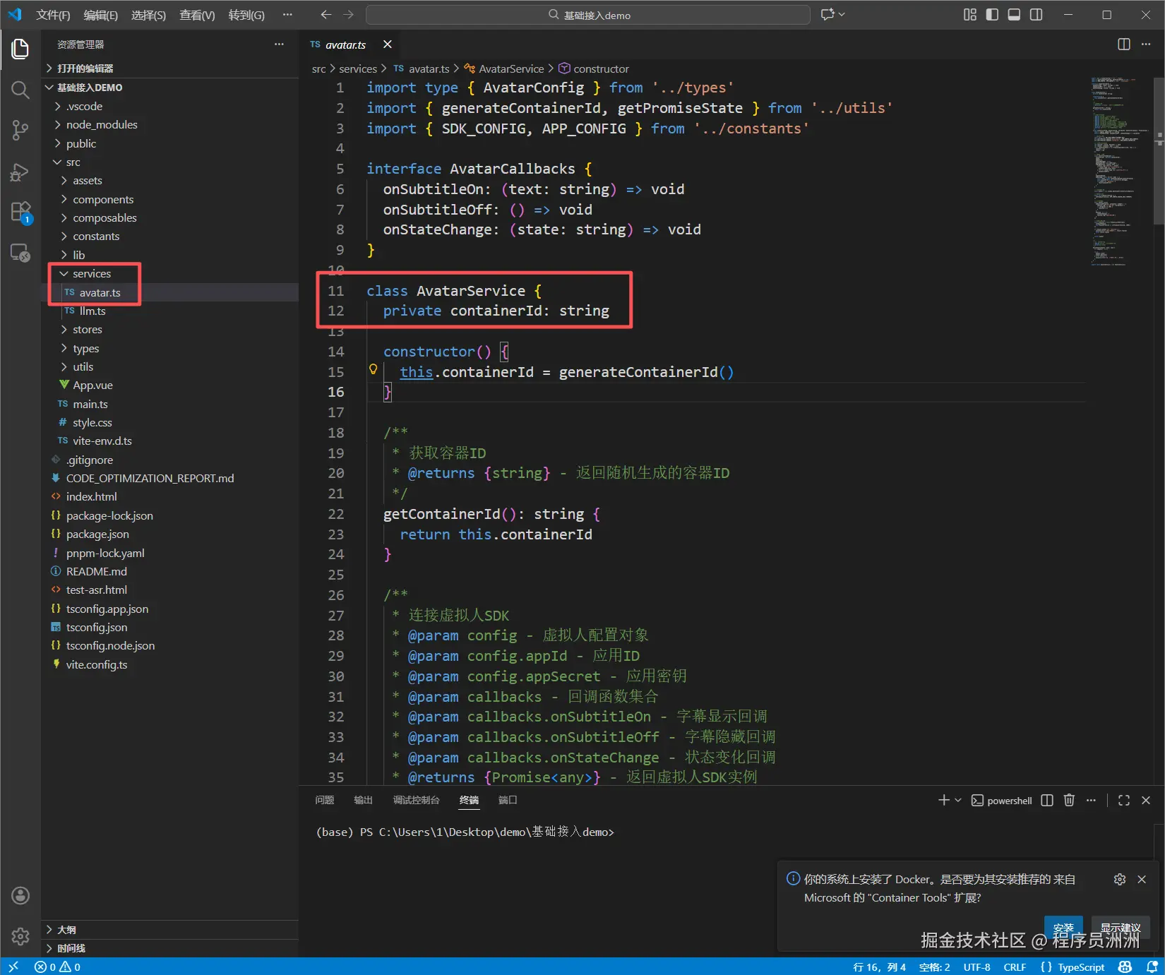 service层的avatar.ts文件是demo中的核心文件,这份代码定义了一个 AvatarService 类(虚拟人服务类),核心作用是封装虚拟人 SDK 的连接、断开、容器 ID 管理等核心操作,是前端调用虚拟人(数字人)SDK 的一层封装,简化了外部调用的复杂度。