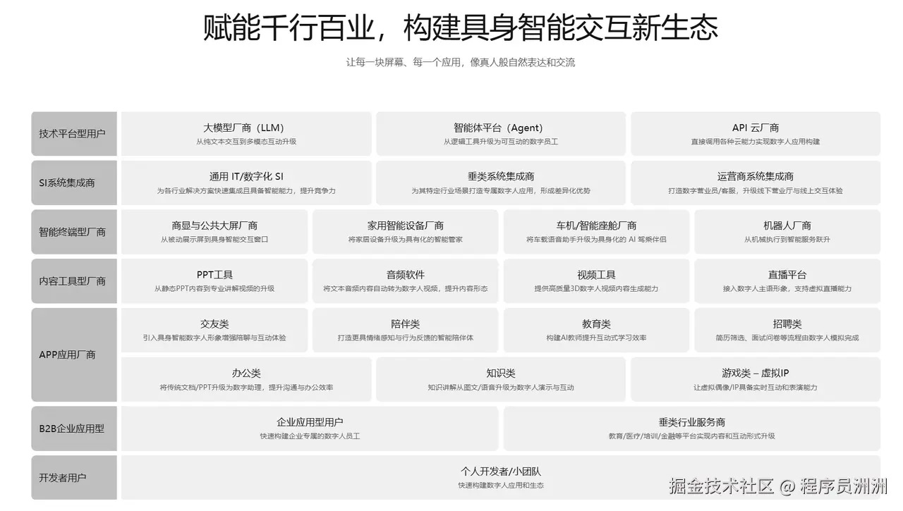 这套从技术到场景的全链路方案,不仅让开发者能快速构建 “有身体” 的智能应用,更让具身智能从实验室走向产业落地,成为推动各行业数字化交互升级的核心基建。