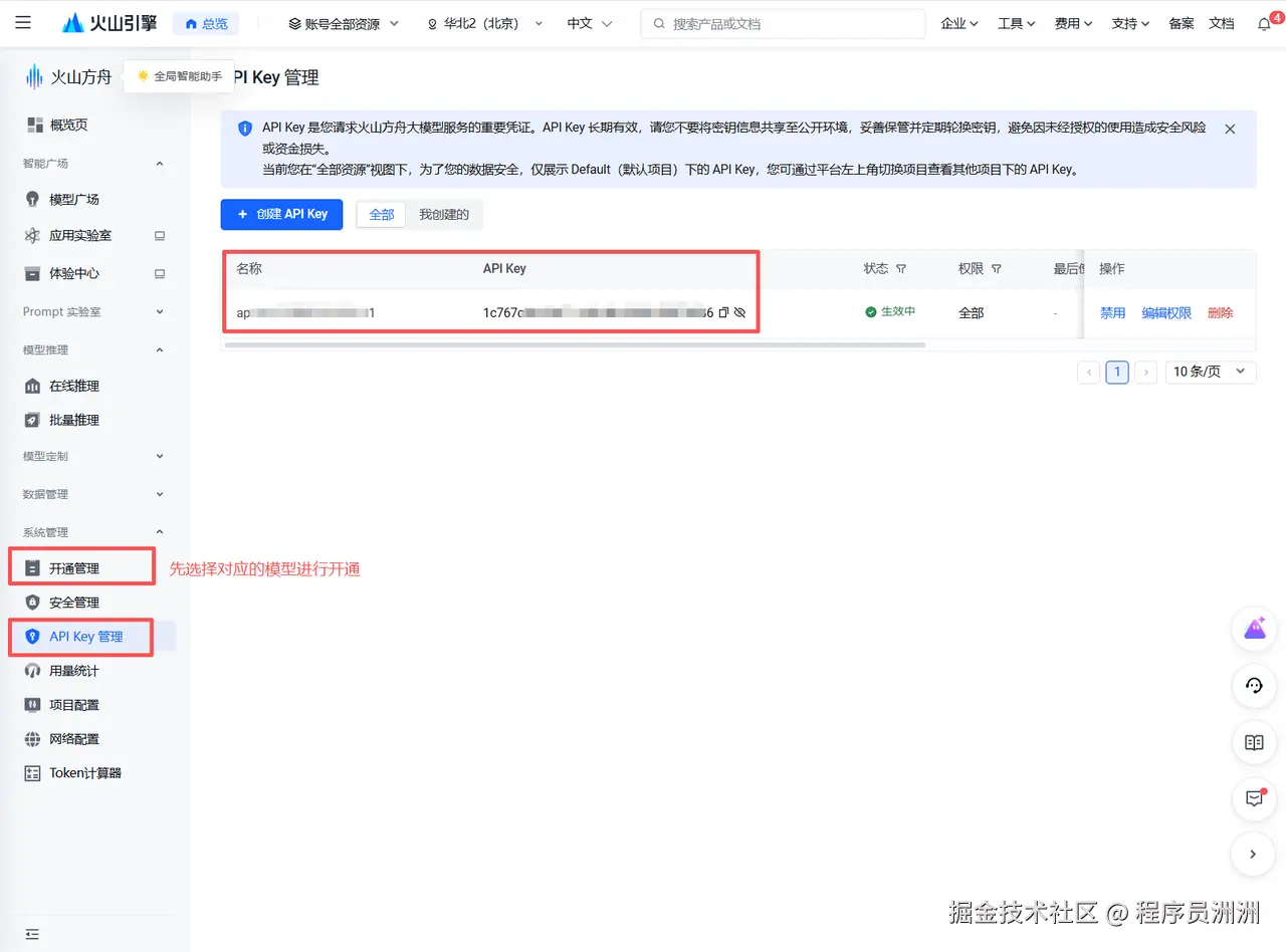 接下来我们需要开通大模型的API,这里采用火山引擎的大模型(console.volcengine.com/ark/region:…