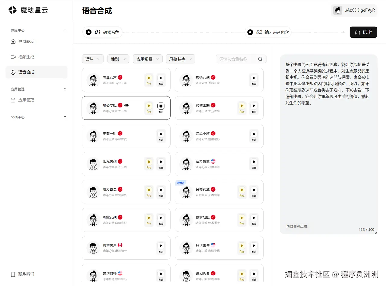感兴趣的小伙伴都可以登录官网体验一下,比较让我惊艳的一点是,在语音合成这个功能中,可以选择多个语种、以及应用场景,可以根据需要自行进行搭配,并且每个声音都非常好听和清脆,没有给我一种听起来“平庸”的感觉。多个场景搭,总有一个适合你。