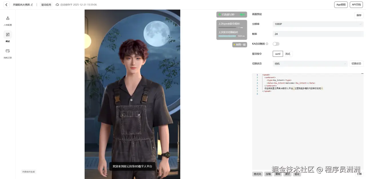 接着我们点击调试,就可以看看效果了。右侧方的基础代码可以配置数字人要说的话,可以看整体的一个动态效果。