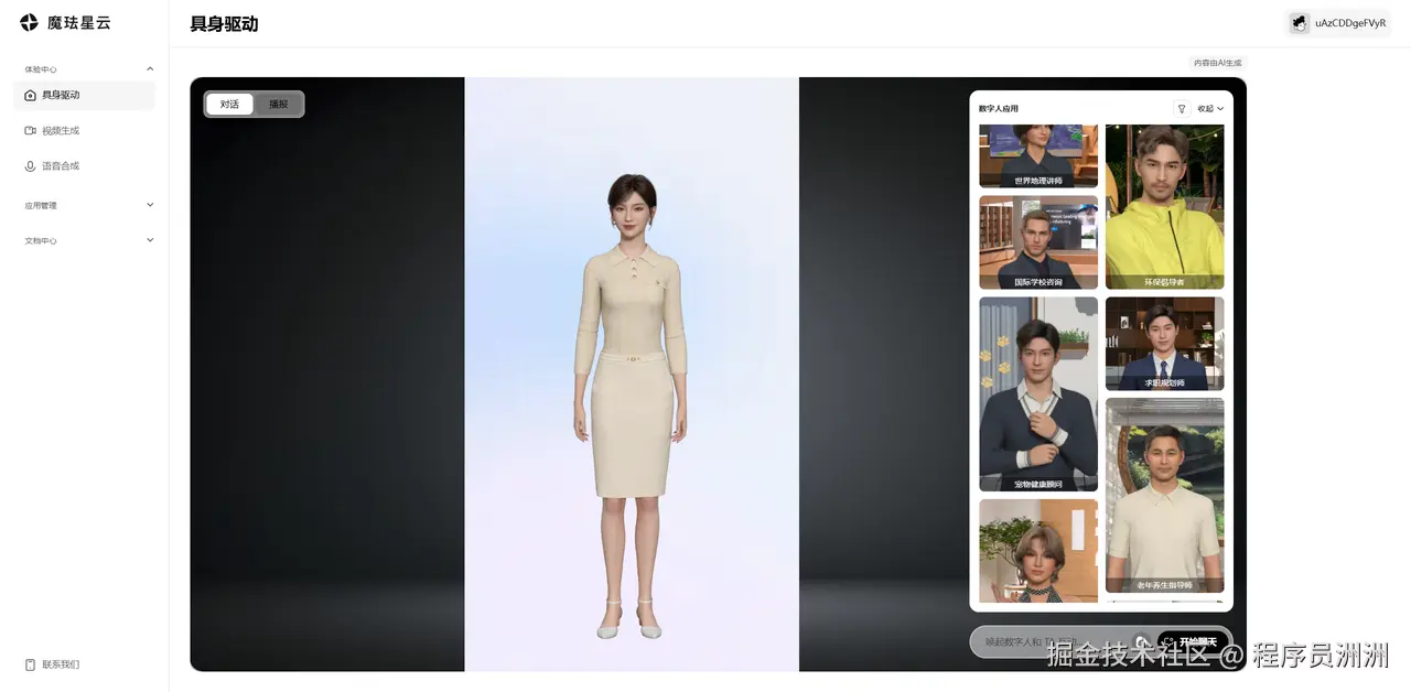 登录之后,可以在左侧的“体验中心”栏中看到刚刚对应的三种体验,分别是具身驱动、视频生成、语音合成。