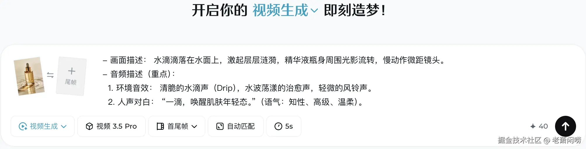 - 结果: 视频生成后,水滴声卡点精准,旁白声音高级,完全达到了信息流广告的投放标准。