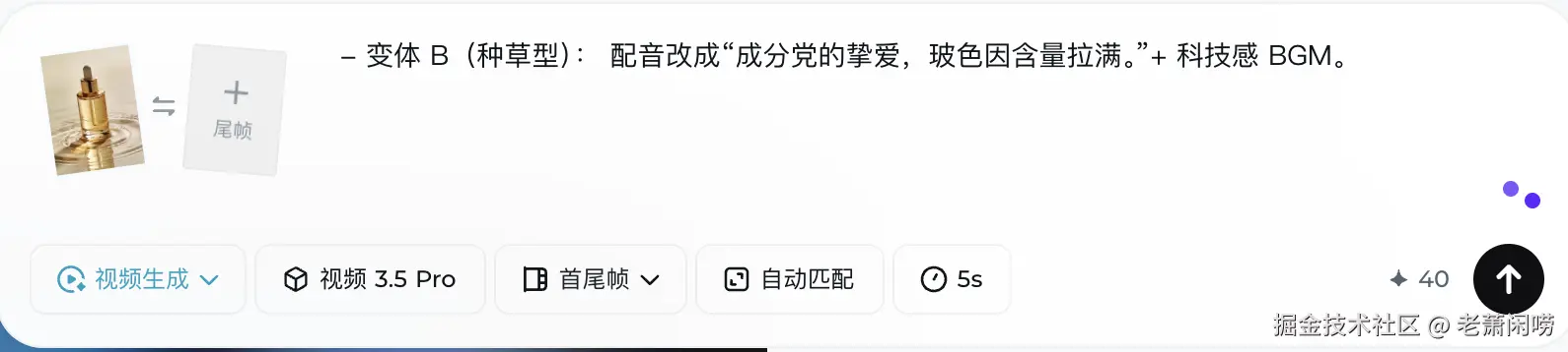 - 变体 B(种草型): 配音改成“成分党的挚爱,玻色因含量拉满”+ 科技感 BGM。