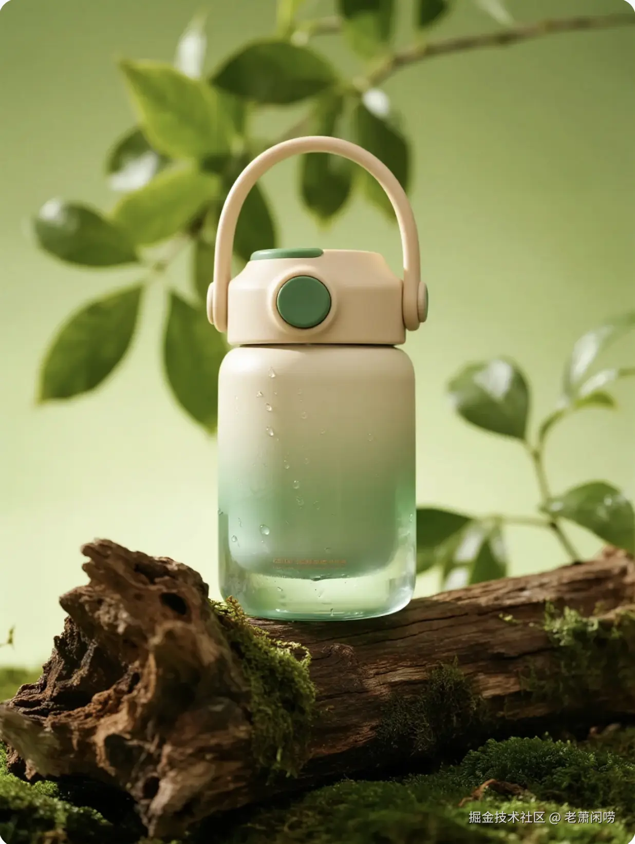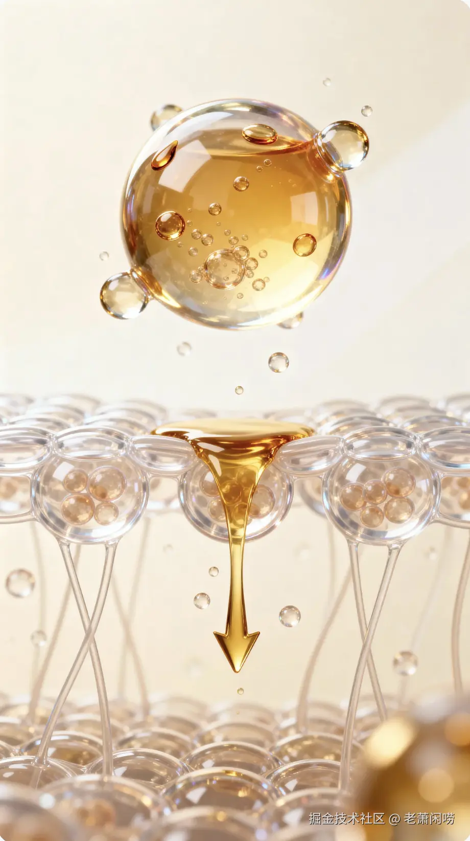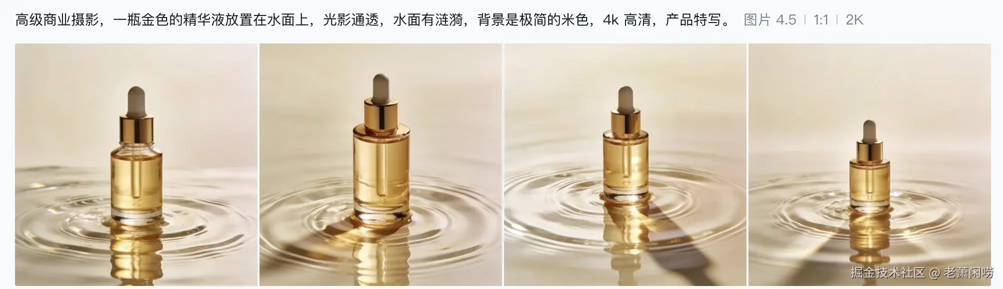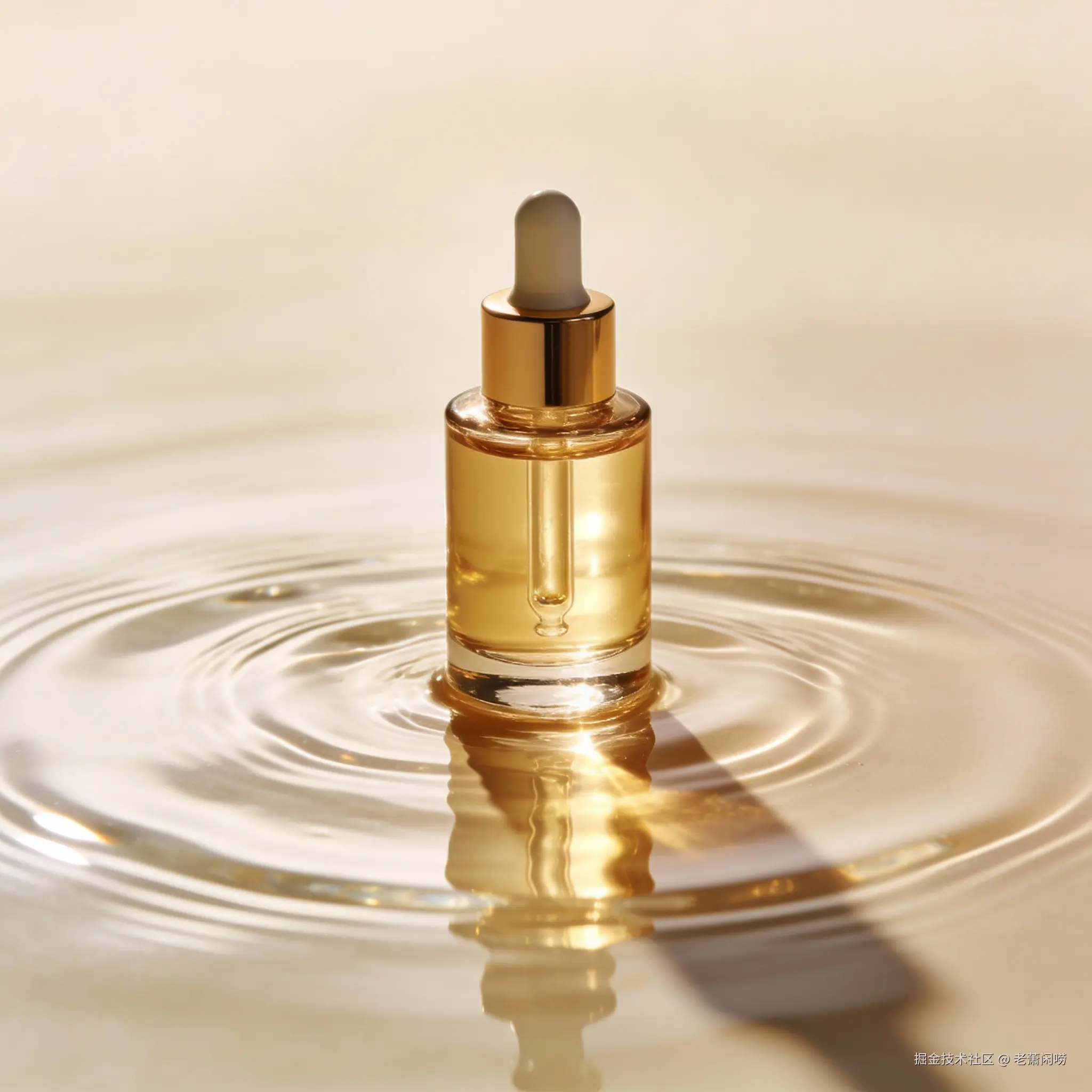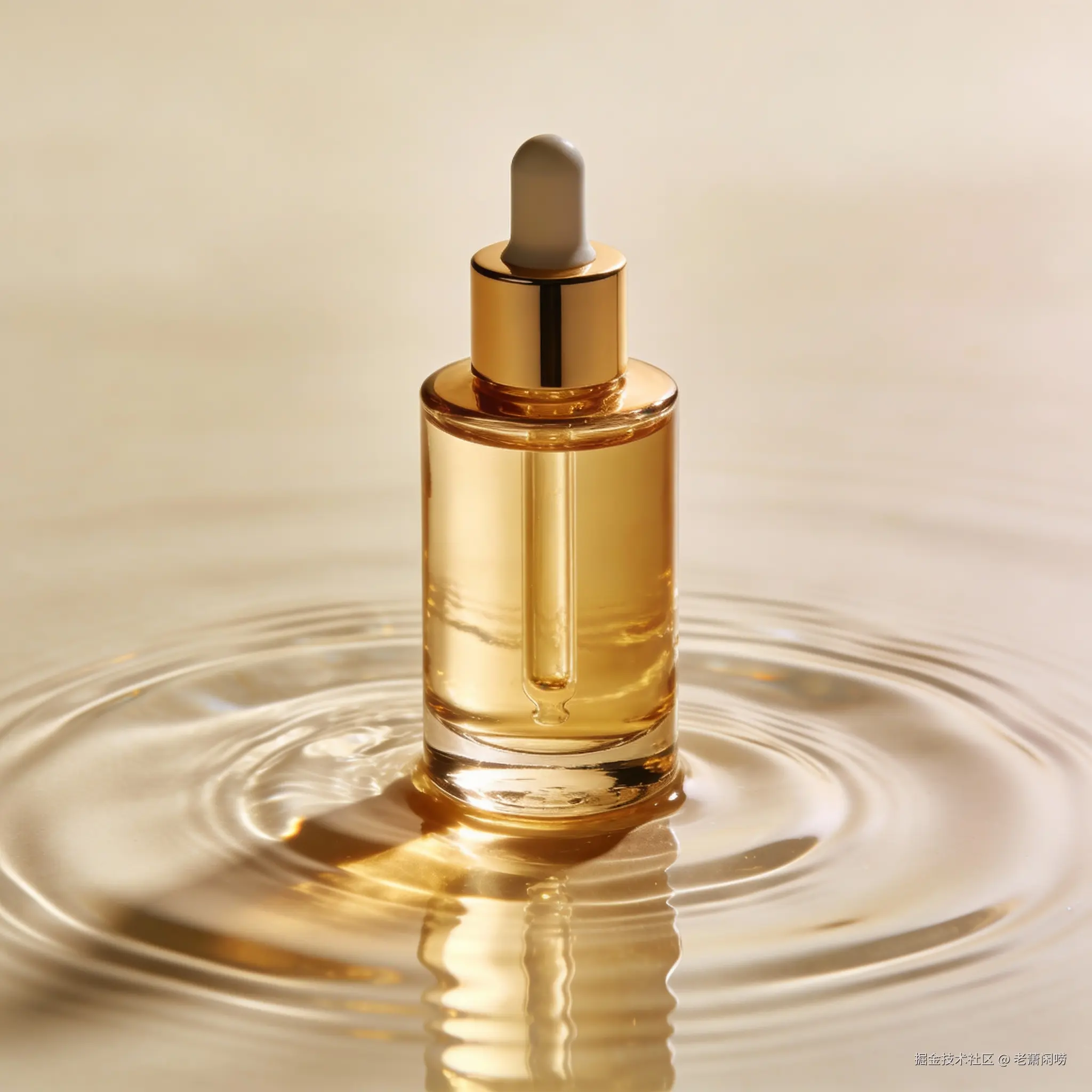 高级商业摄影,一瓶金色的精华液放置在水面上,光影通透,水面有涟漪,背景是极简的米色,4k 高清,产品特写。