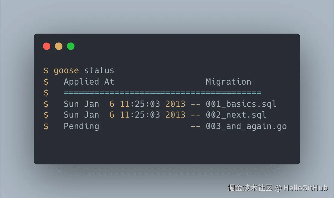 8、goose:开箱即用的数据库迁移工具。这是一个 Go 语言开发的数据库迁移工具,提供 CLI 和第三方库两种使用方式,可通过 SQL 文件实现常规迁移,也可编写 Go 代码处理复杂的迁移逻辑,兼容 Postgres、MySQL、ClickHouse 等数据库。