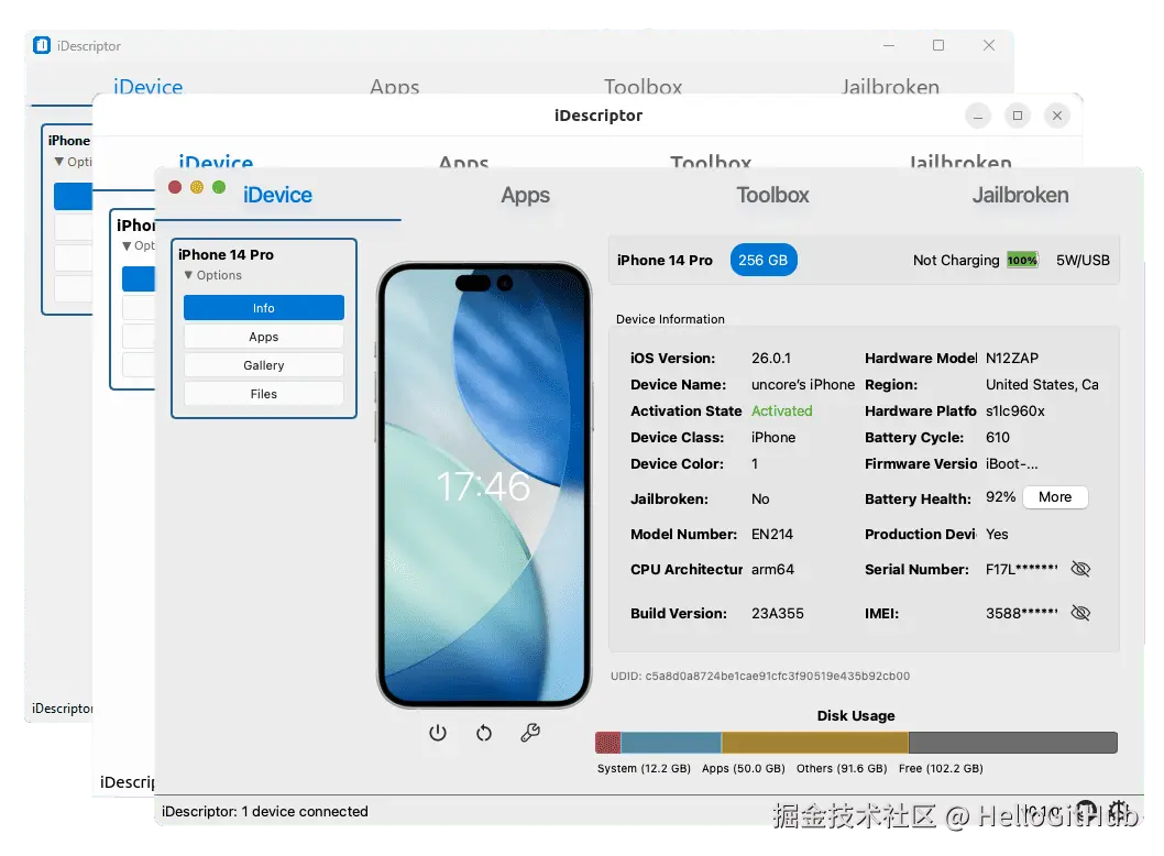 6、iDescriptor:跨平台的 iOS 设备管理工具。这是一款免费、开源、跨平台的 iPhone/iPad 设备管理工具,支持文件管理、导入相册、虚拟定位、AirPlay 投屏、数据线真伪识别等功能,适用于 Windows、Linux 和 macOS 系统。