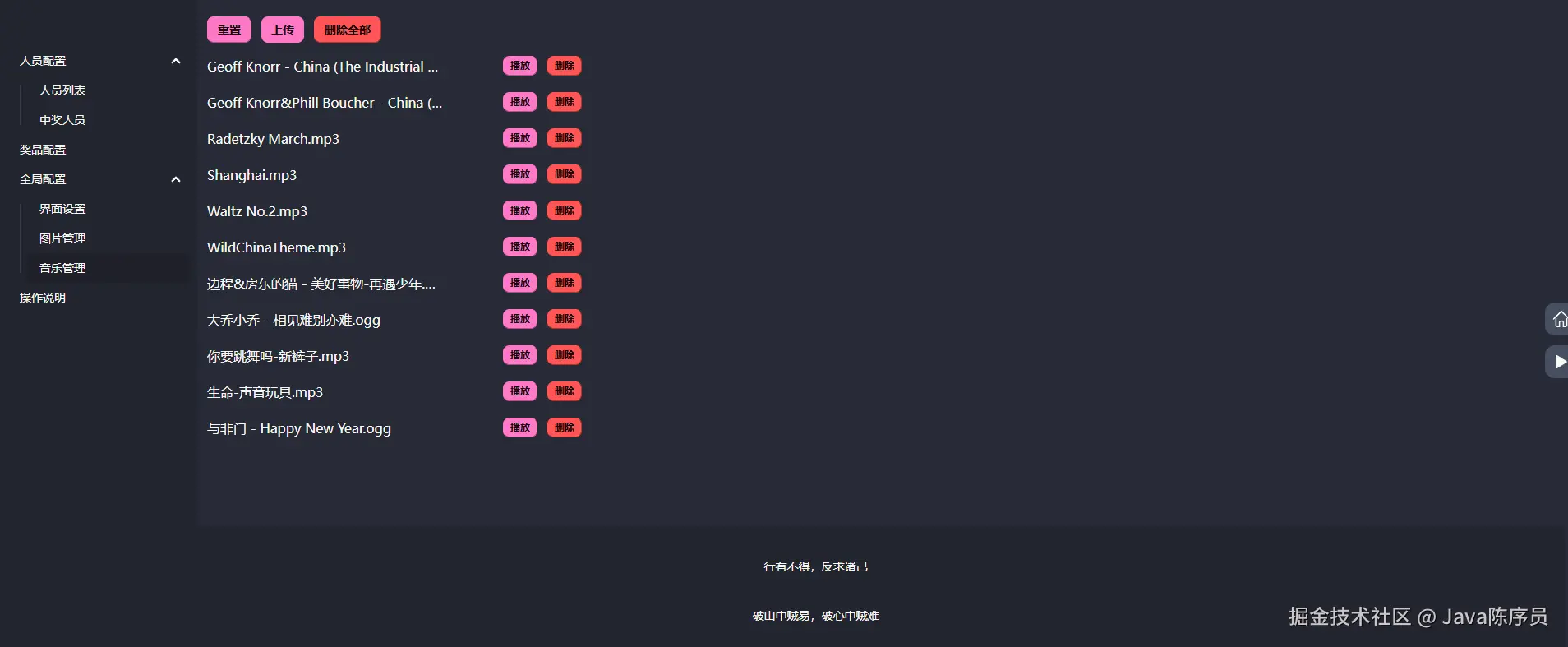 - 音乐管理:支持上传背景音乐并形成播放列表,左键点击播放/暂停,右键切换下一首
