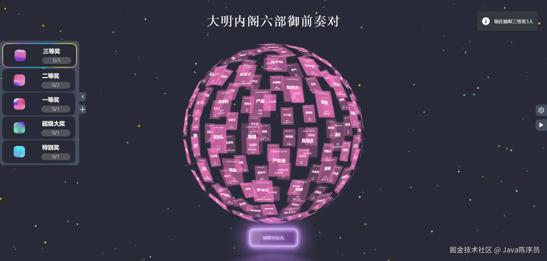- 炫酷 3D 球体效果:采用 Threejs 实现的 3D 球体抽奖动画,视觉效果突出,适合年会等活动氛围