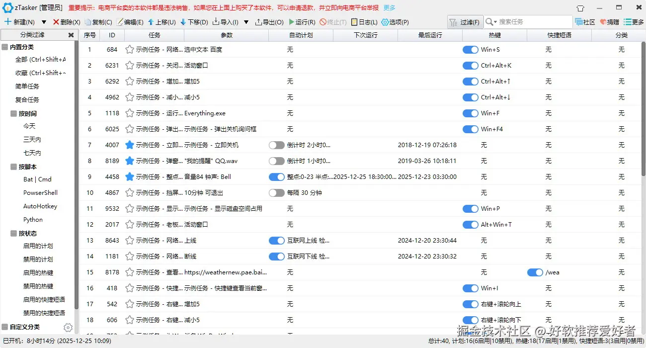 zTasker v2.3.4 是一款专为Windows系统设计的免费自动化任务工具,支持从Win7到Win11等多个版本。这款工具体积轻巧,仅8MB左右,却能够通过热键、定时或系统条件触发上百种任务,帮助用户有效提升操作效率。无论是个人日常使用还是企业办公场景,zTasker都能成为得力的效率助手。