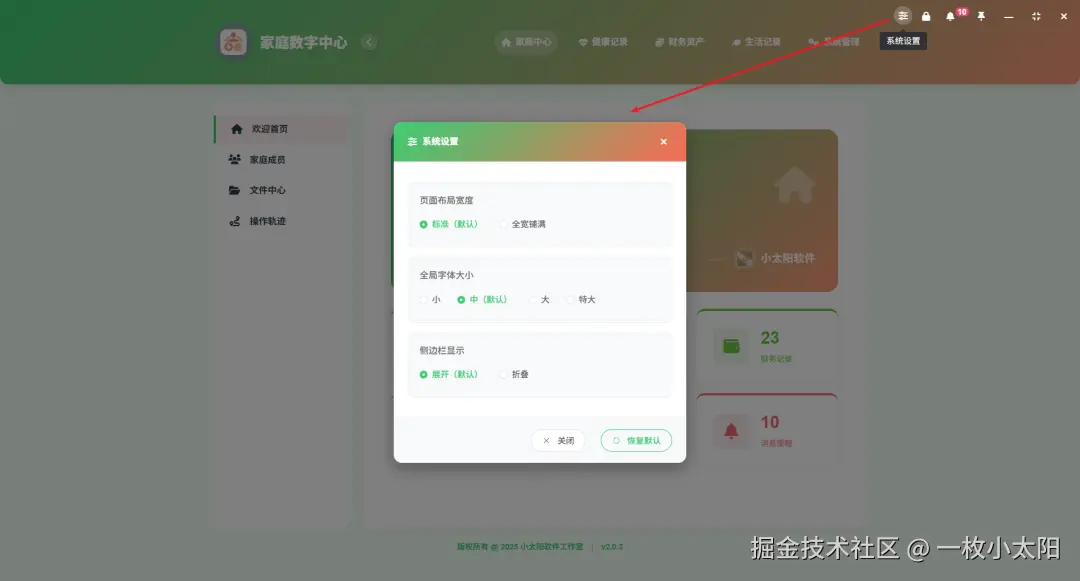顶部标题栏中,有一个系统设置图标、锁屏图标,用来设置页面布局宽度、字体大小、侧边栏显示、锁屏,满足不同用户的个性化需求