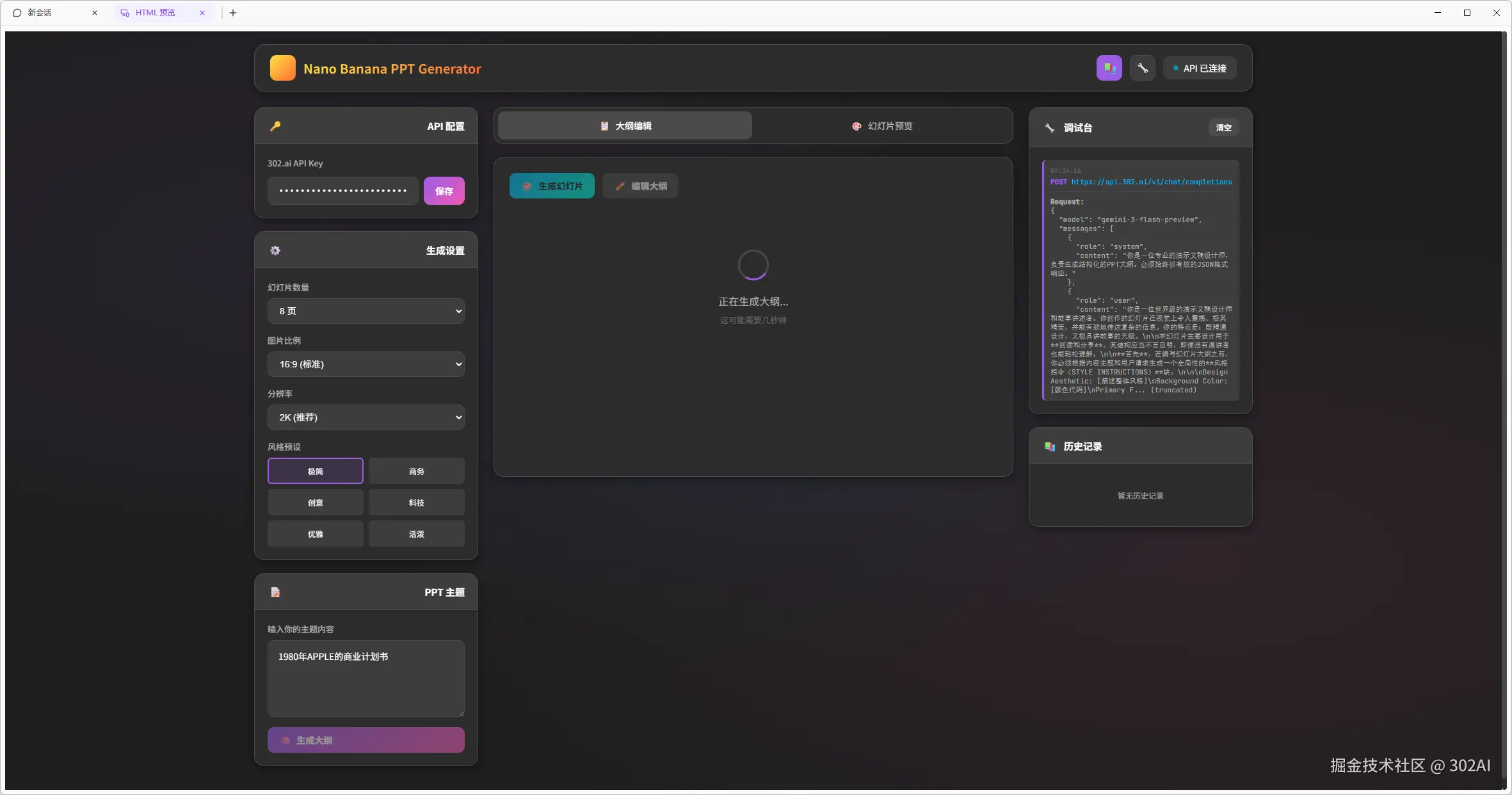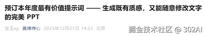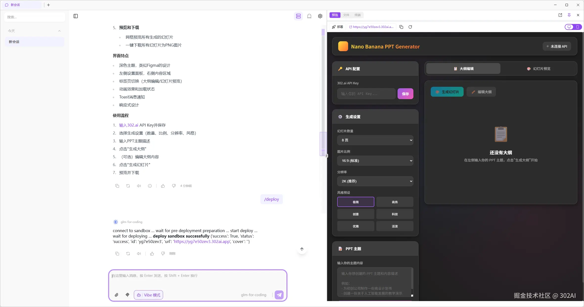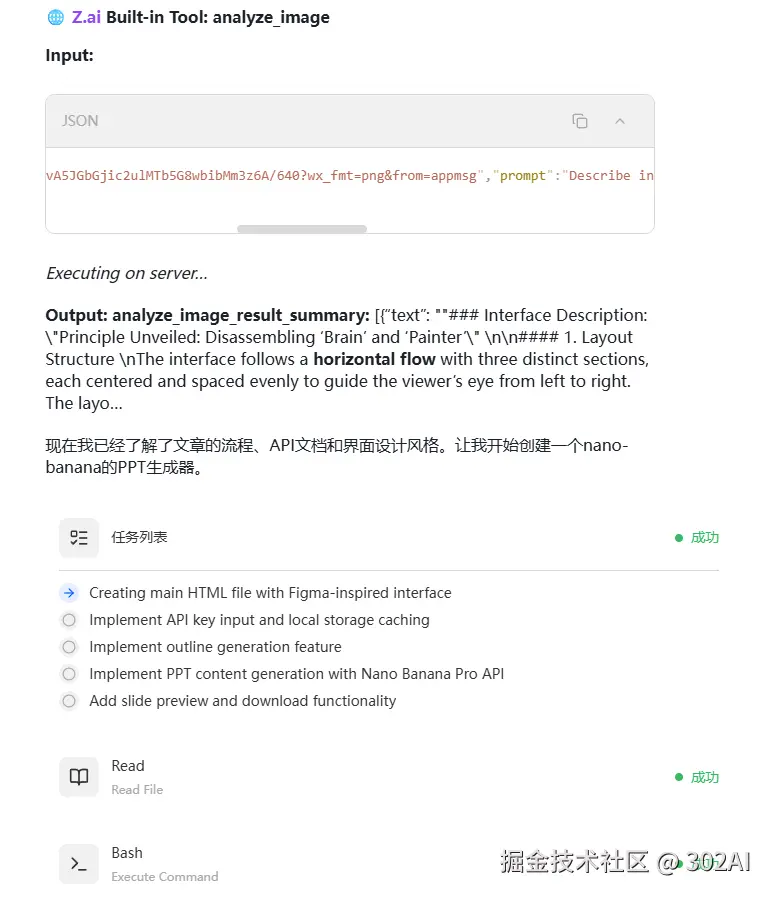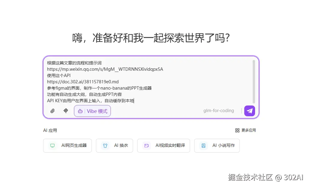 这里以赛博禅心的这篇公众号为基础,使用最新的GLM-4.7作为编程模型,调用302.AI的Nano-Banana API,制作一个PPT生成器。
