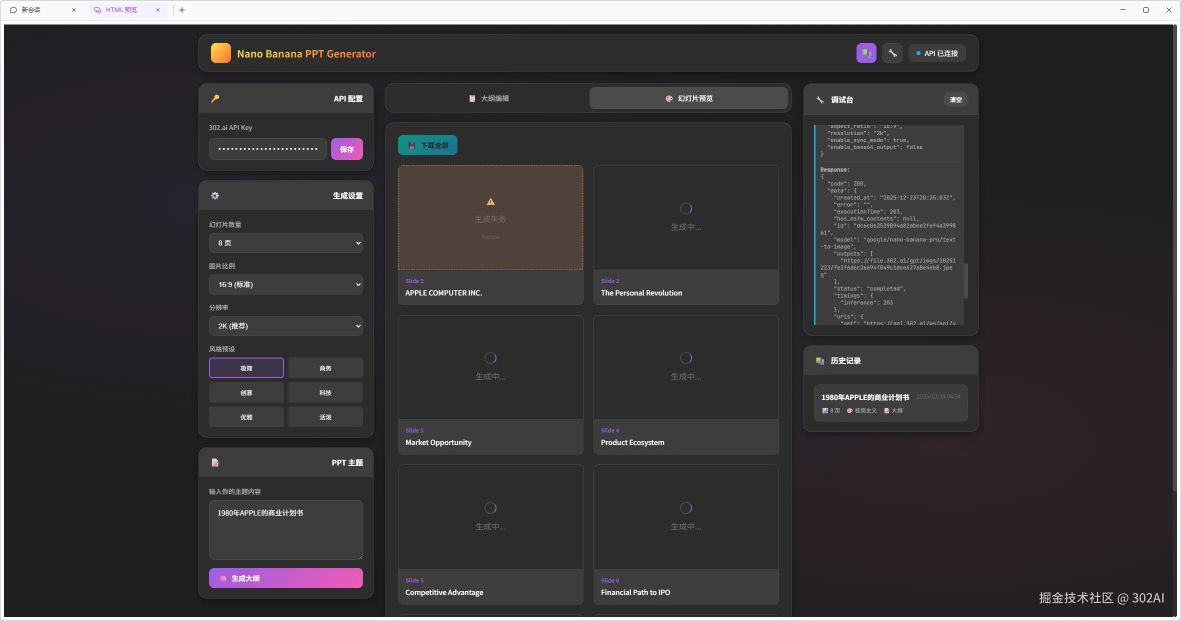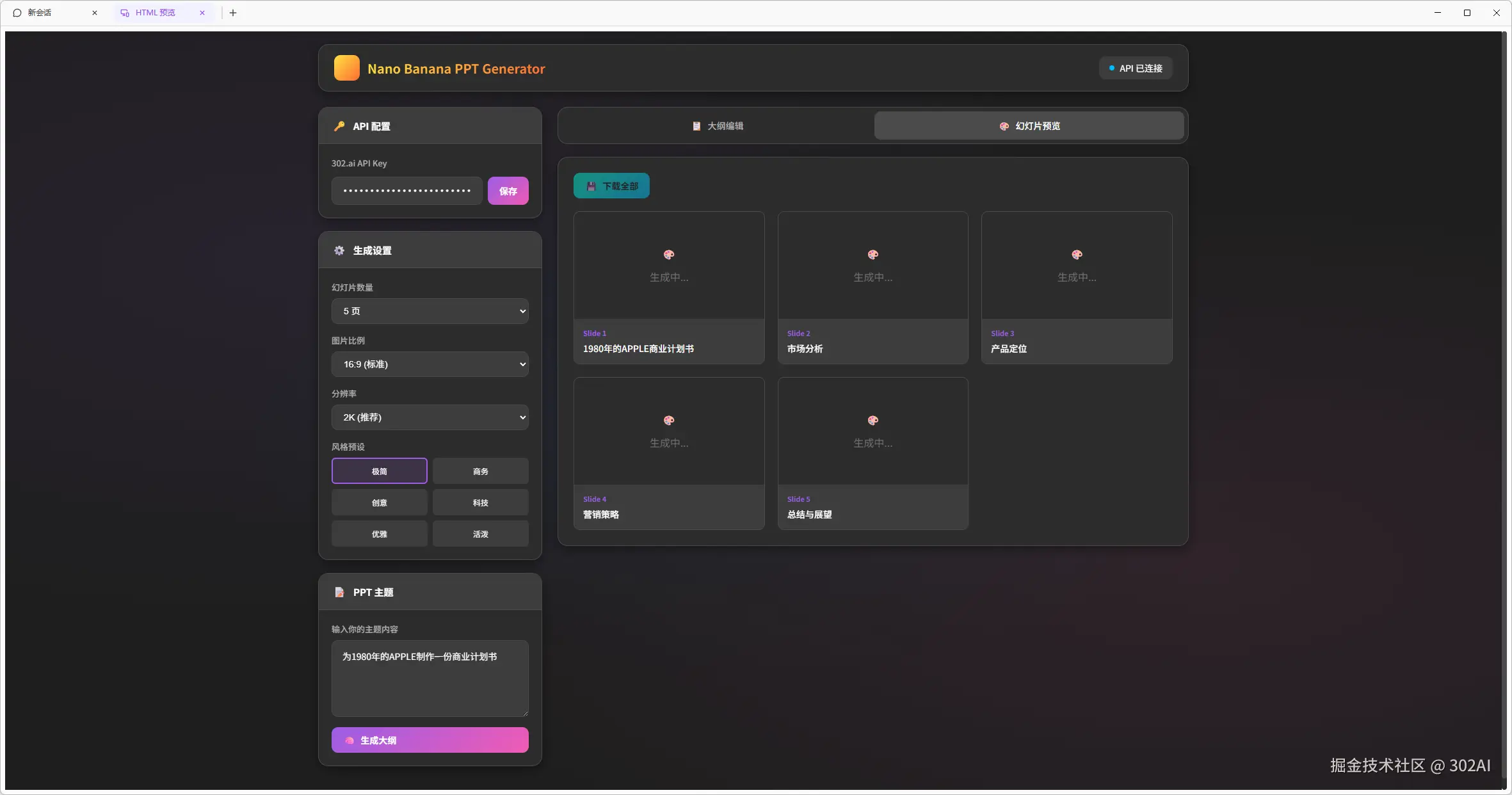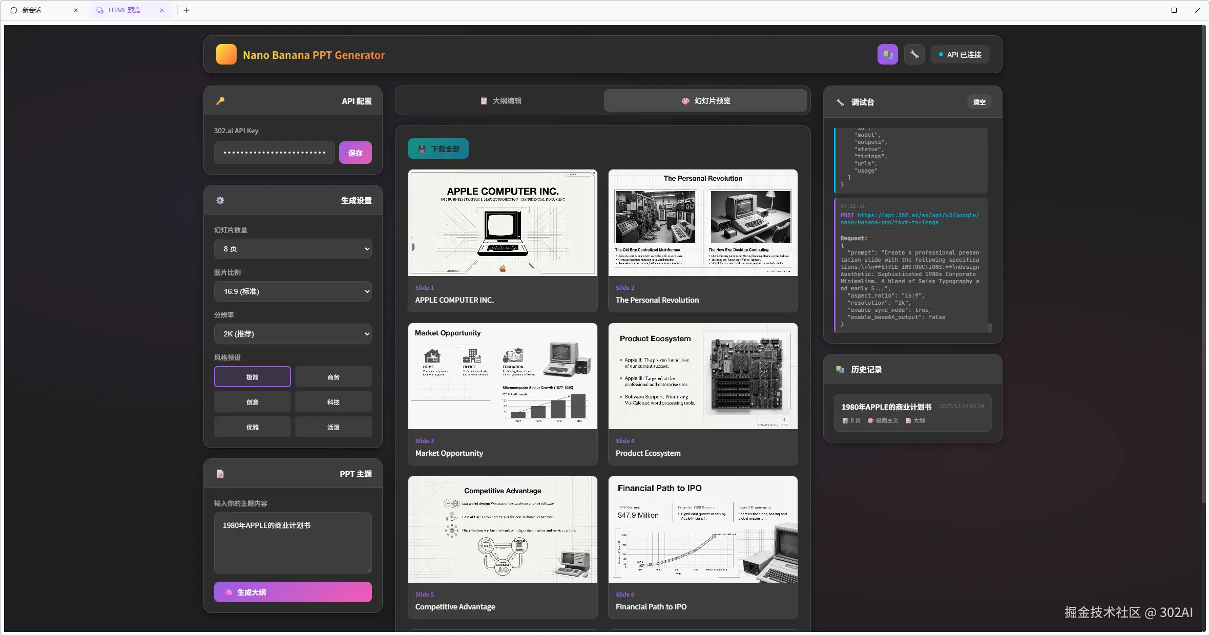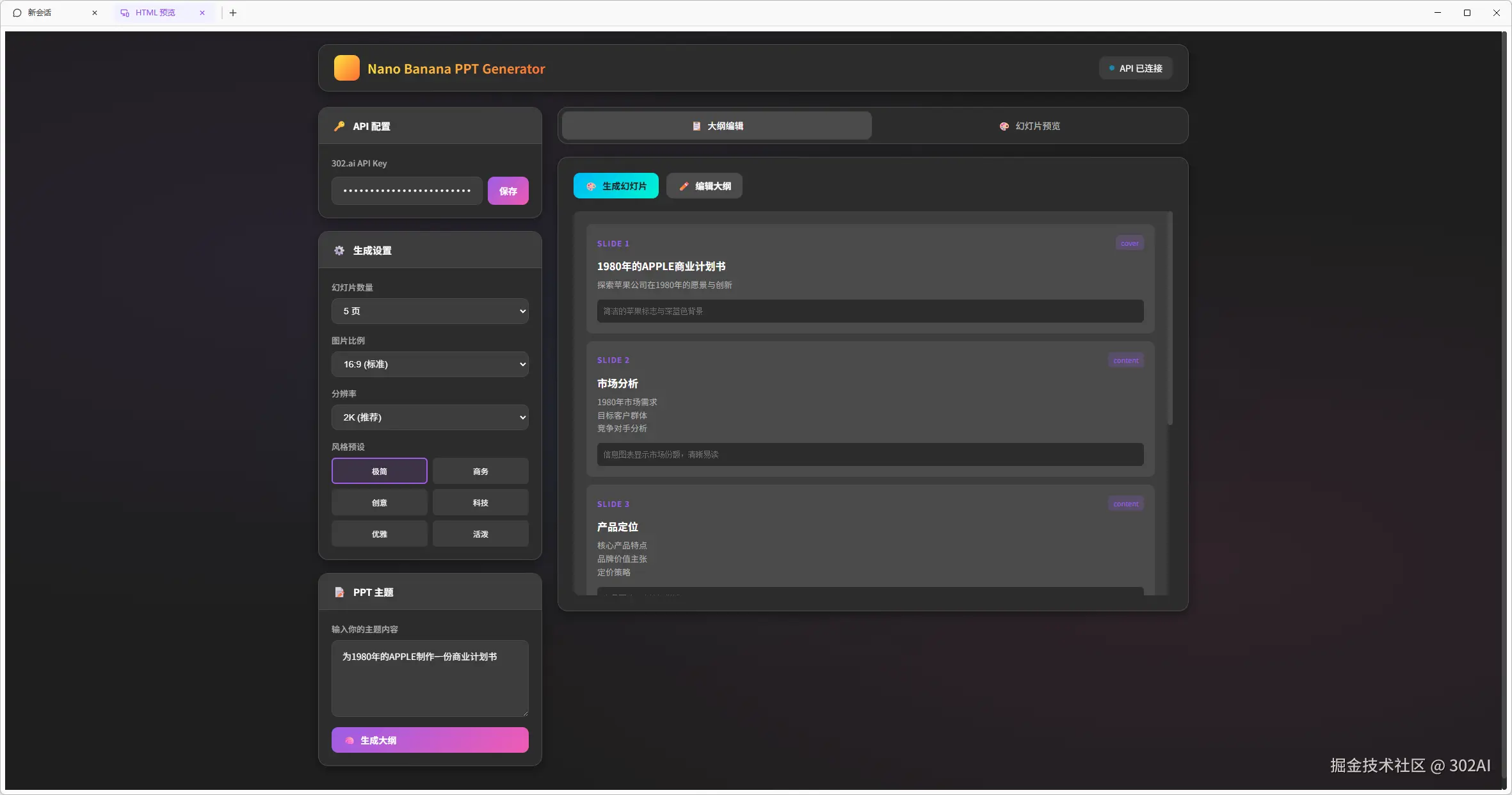 这里以赛博禅心的这篇公众号为基础,使用最新的GLM-4.7作为编程模型,调用302.AI的Nano-Banana API,制作一个PPT生成器。