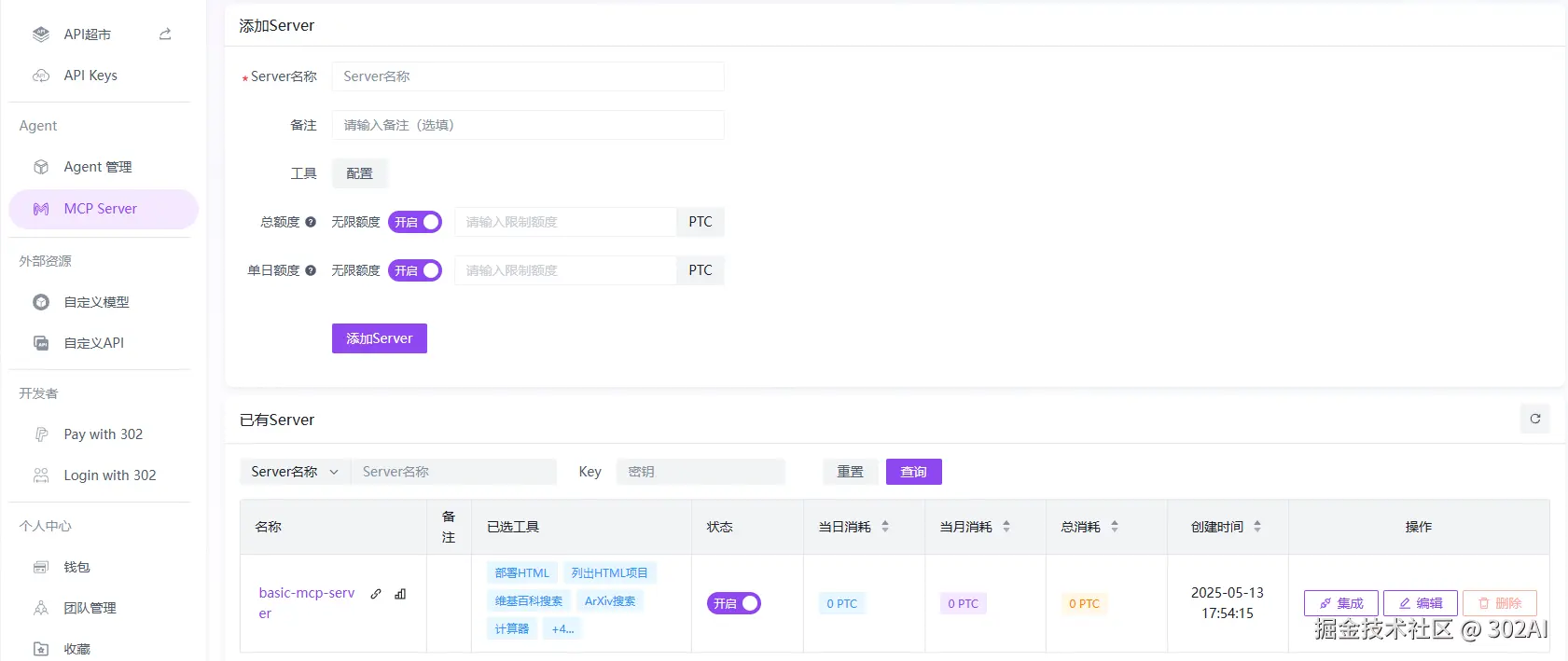 在302.AI的后台进入MCP Server菜单,新建或使用已有的Server,点击集成按键。