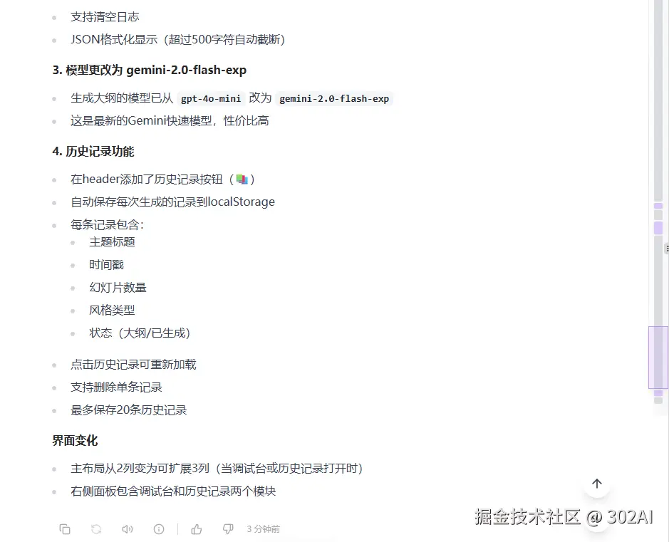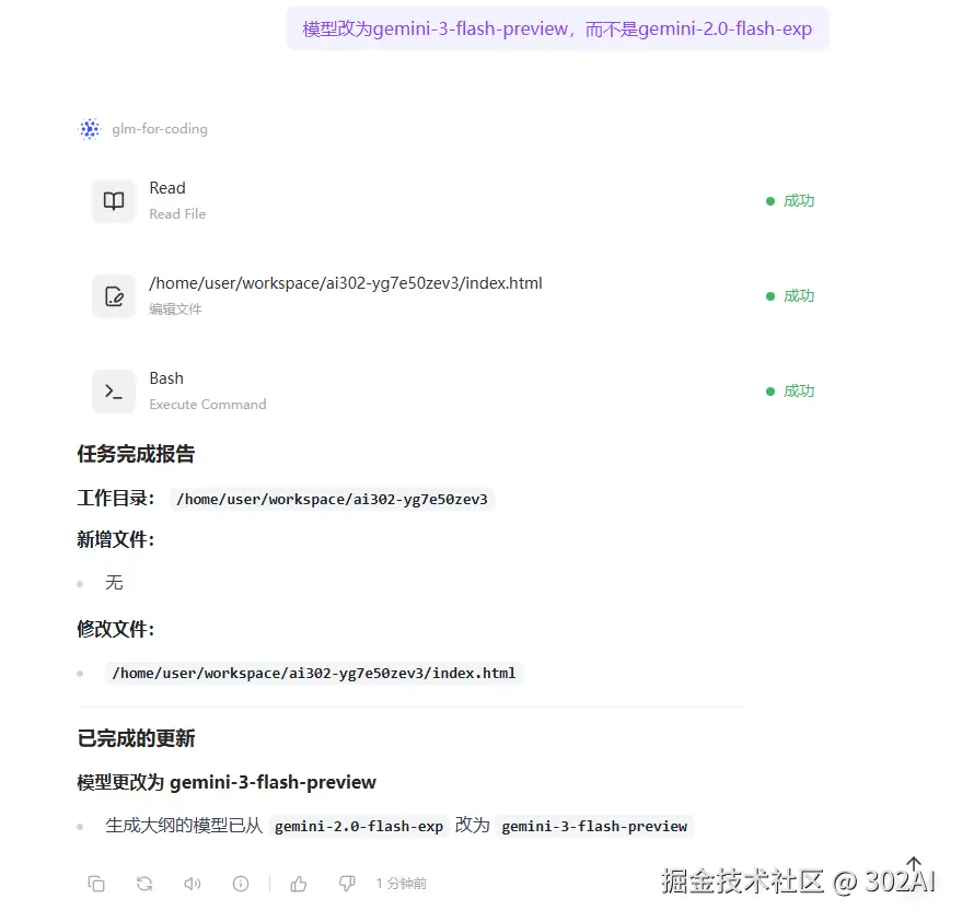 但是可以看到,这里AI出现了幻觉,我在提示词非常明确的说明了是gemini-3-flash-preview。