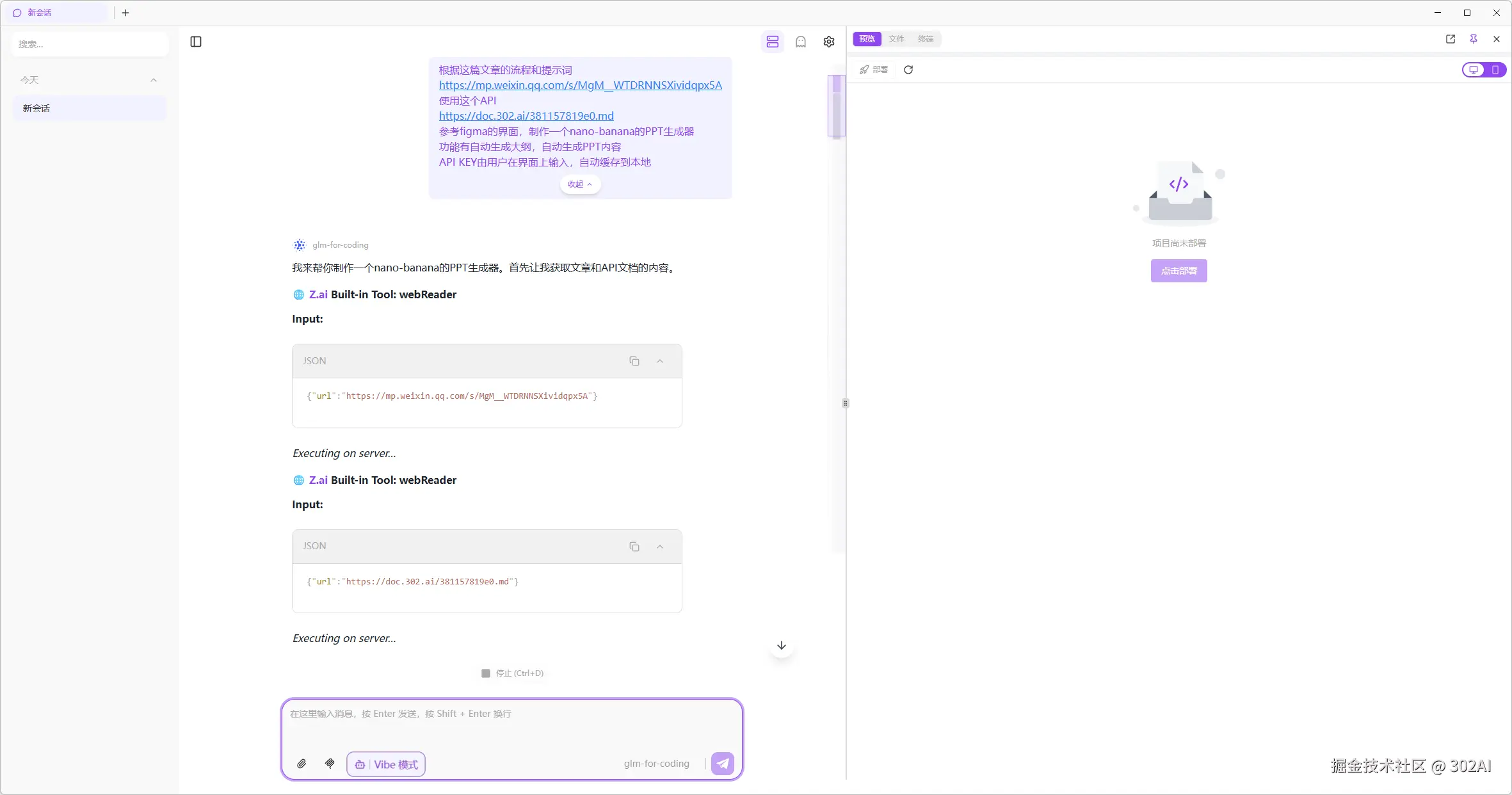 302.AI客户端,将市面上最强大的编程工具 - Claude Code放到了沙盒中,封装了一层用户友好的UI,搭配上一键部署功能,让Vibe Coding变得即简单,又强大。编程不再是枯燥的苦力活,而是一种轻松、随性、即兴的创造享受。