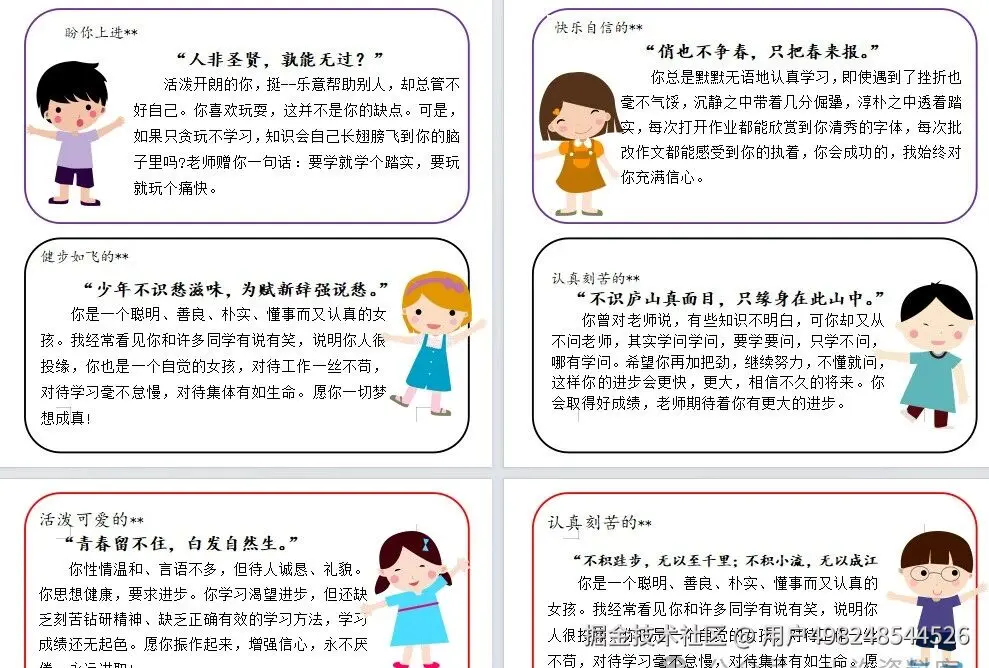 马年主题评语融入“一马当先”“龙马精神”等吉祥寓意,为学生注入奋进力量;“送你一朵花”“星星”等童趣风格,适配低年级学生,用具象化表达传递肯定;古风诗词评语兼具文化底蕴与典雅质感,契合中高年级学生成长认知;卡通人物、花卉等元素的融入,更让评语告别千篇一律,充满个性温度。