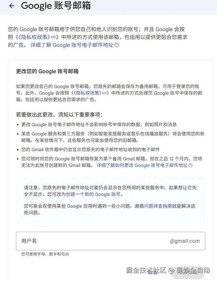 • 您原先的以 gmail.com 结尾的 Google 账号邮箱将成为备用邮箱。详细了解备用邮箱。