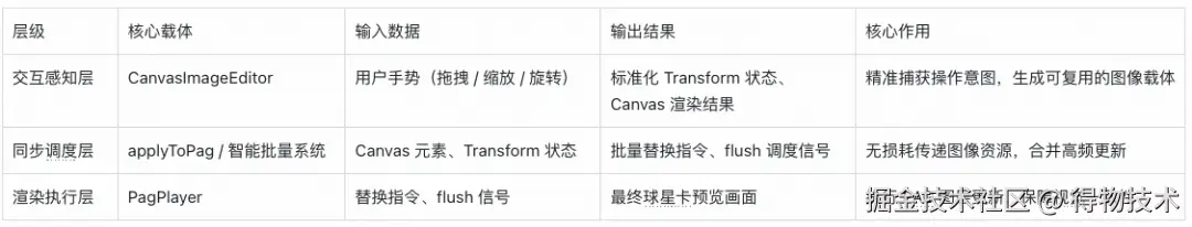 - 预览实时性:设计 “交互感知 - 同步调度 - 渲染执行” 三层模型,通过复用 Canvas 元素、智能批量调度等方案,实现操作与 PAG 预览的即时同步,避免 “调整后延迟反馈” 的割裂感;