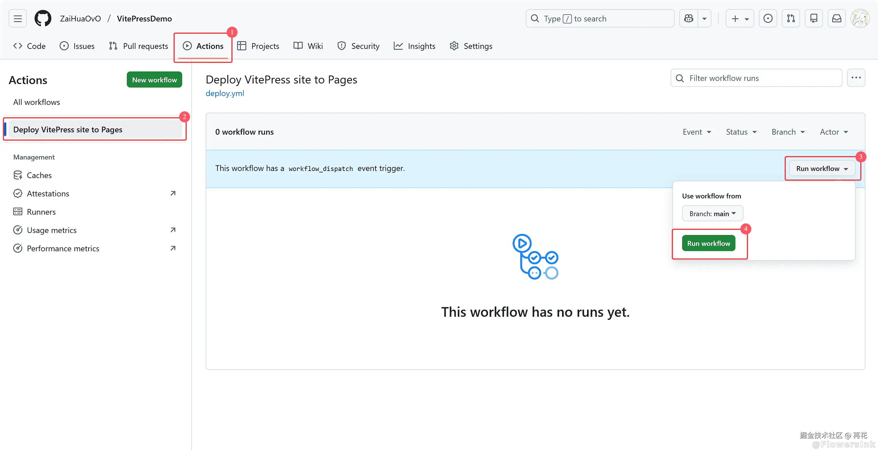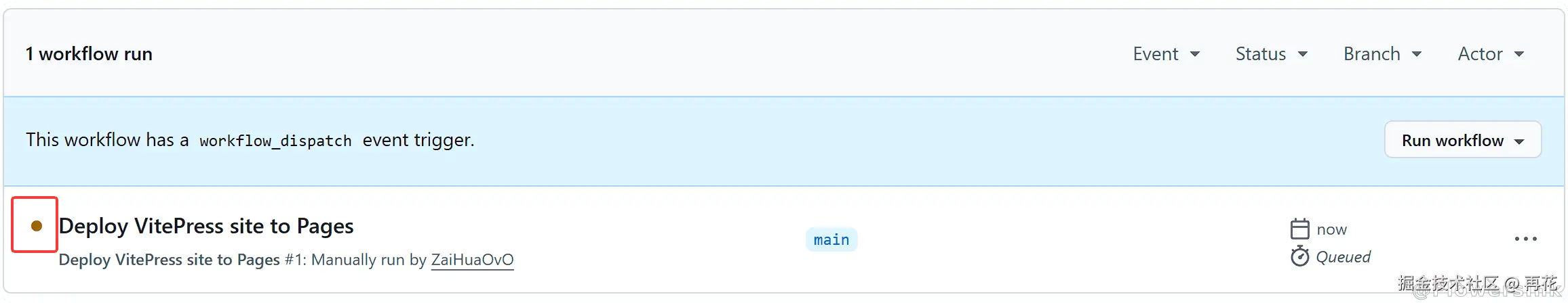 在仓库界面选择Actions-Deploy VitePress site to Pages-Run workflow下拉框-选择Run workflow