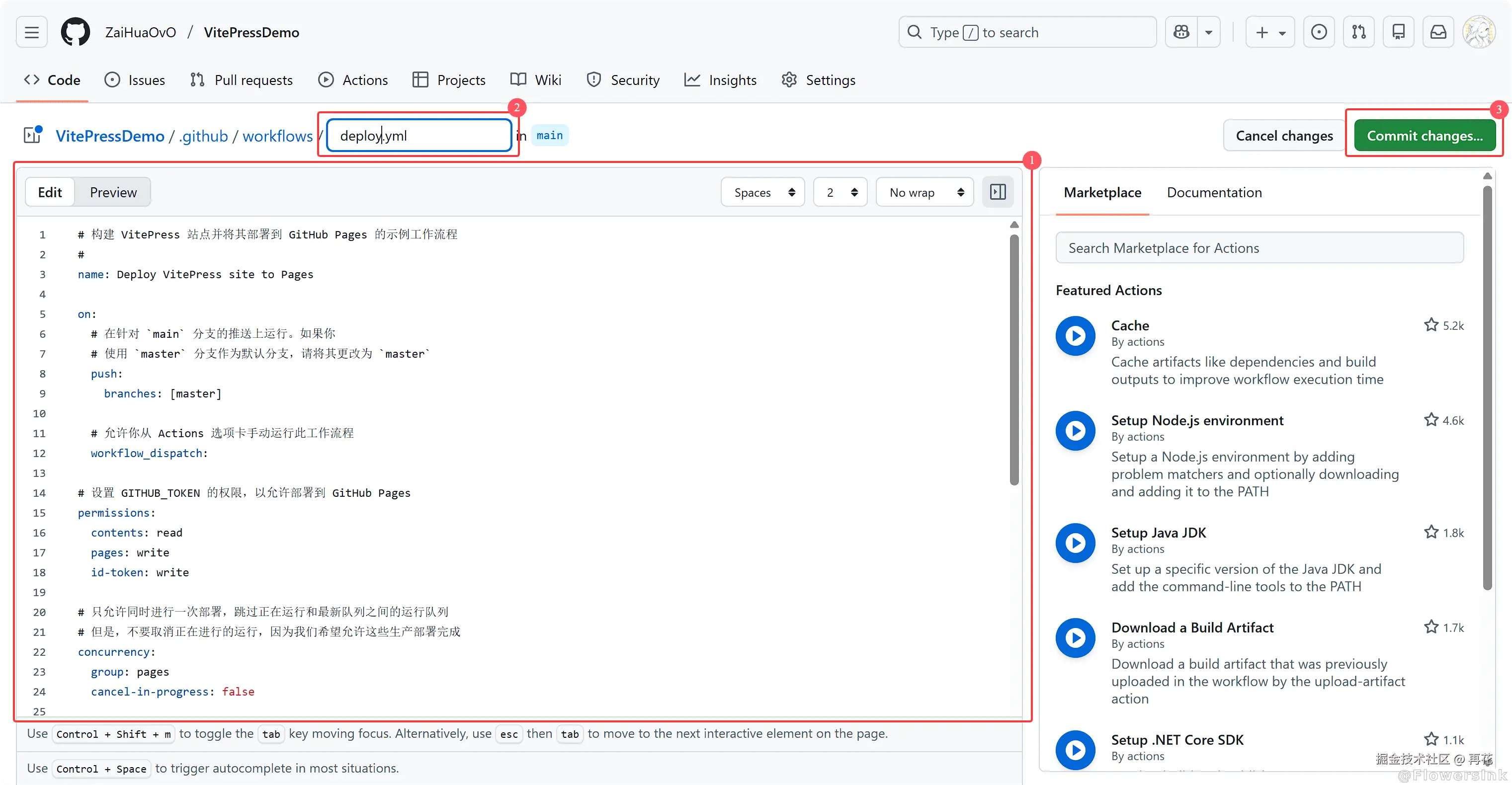 按照如图设置写入代码,并将文件名改为deploy.yml,完成后点击Commit changes