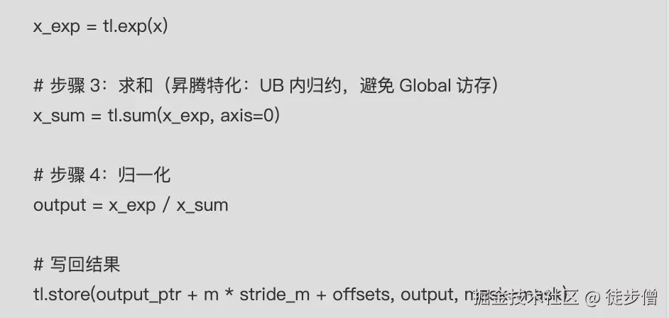 昇腾 Softmax 算子的核心痛点是「分母求和的数值稳定性+UB 资源限制」,官方 Kernel 优化逻辑如下:
