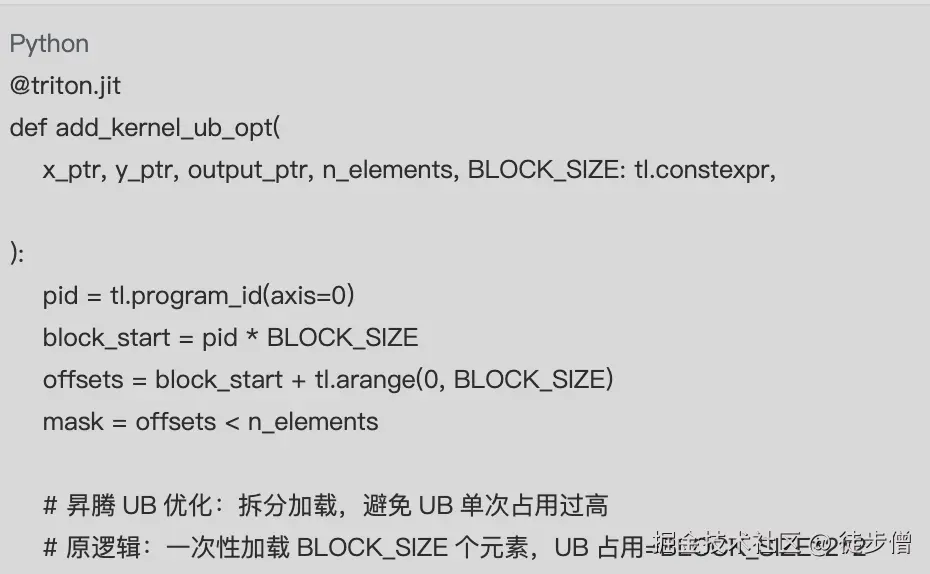 - BLOCK_SIZE 限制:昇腾每个 AI Core 的 UB 仅 192KB,BLOCK_SIZE 过大(如 4096)会导致 UB 溢出,建议 1024/2048 为最优值;