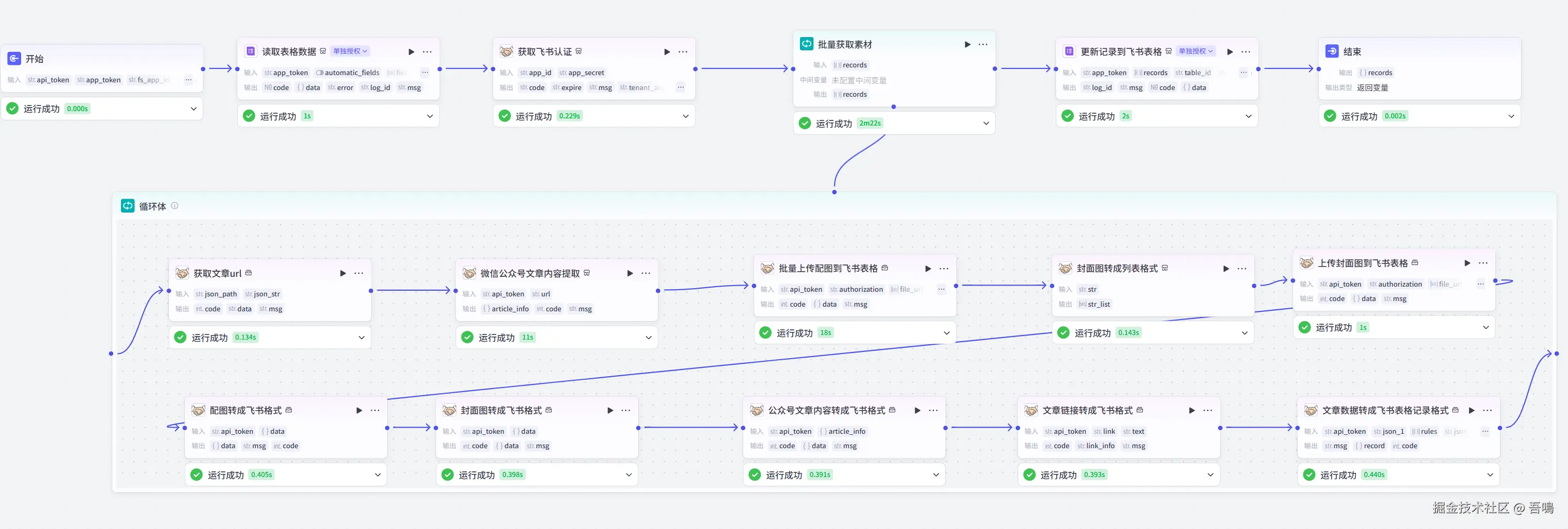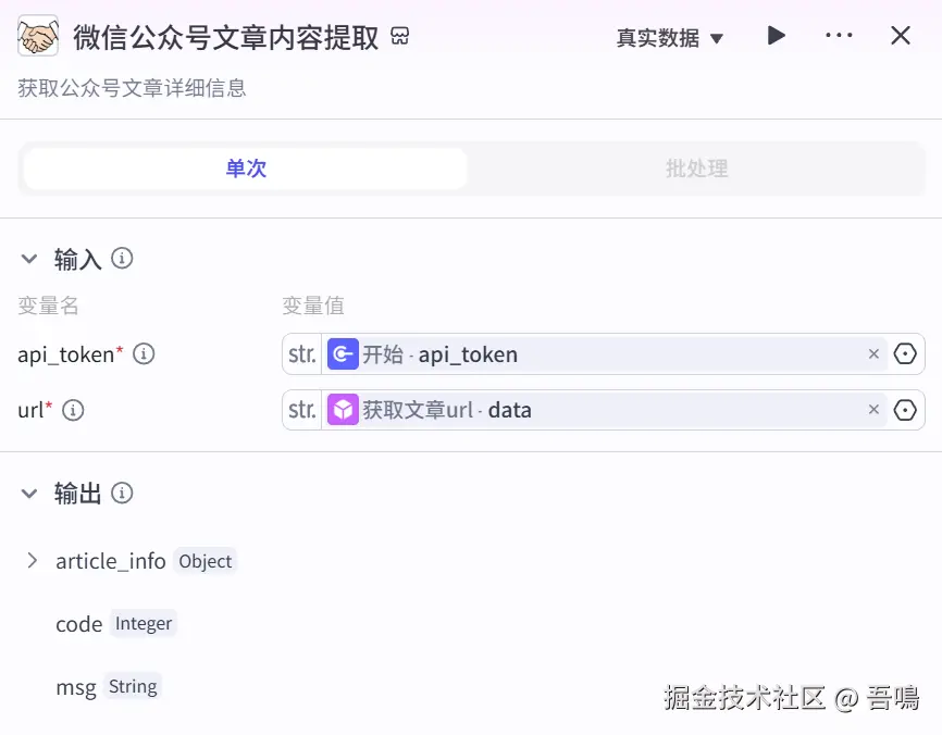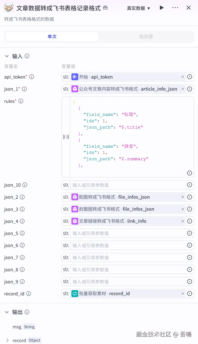 这个工作流有两个难点,第一个是微信公众号文章的内容信息的提取,第二个就是多维表格中的字段类型并非都是简单类型,需要对数据的处理较多。