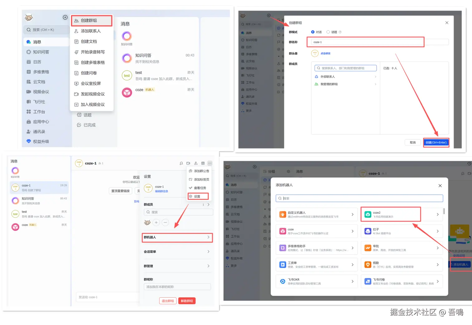 这个操作需要在飞书客户端进行,创建好群组之后将刚刚创建的应用机器人作为群机器人。