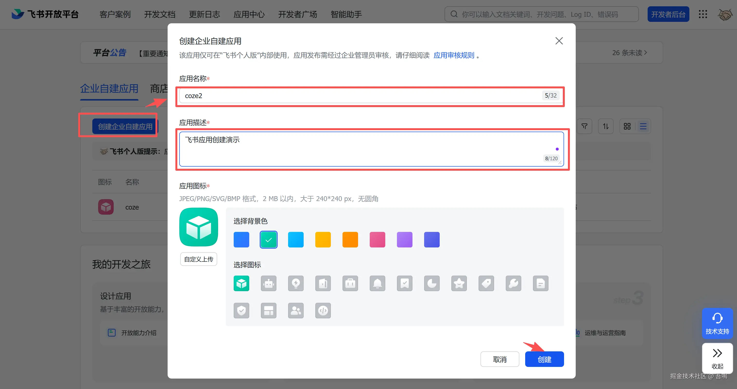 进入到飞书的开放者后台(open.feishu.cn/app?lang=zh…),点击“创建企业自建应用按钮”,输入应用名称、应用描述等信息后,点击“创建”。