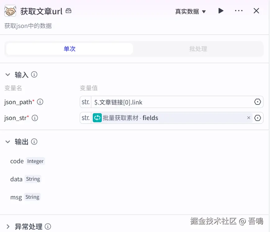 因为从飞书表格中读取出来的文章链接并非只有链接,所以这个节点的作用就是把文章的链接给提取出来,使用到了扣子三方插件【字符串工具合集】的【get_json_value】工具。