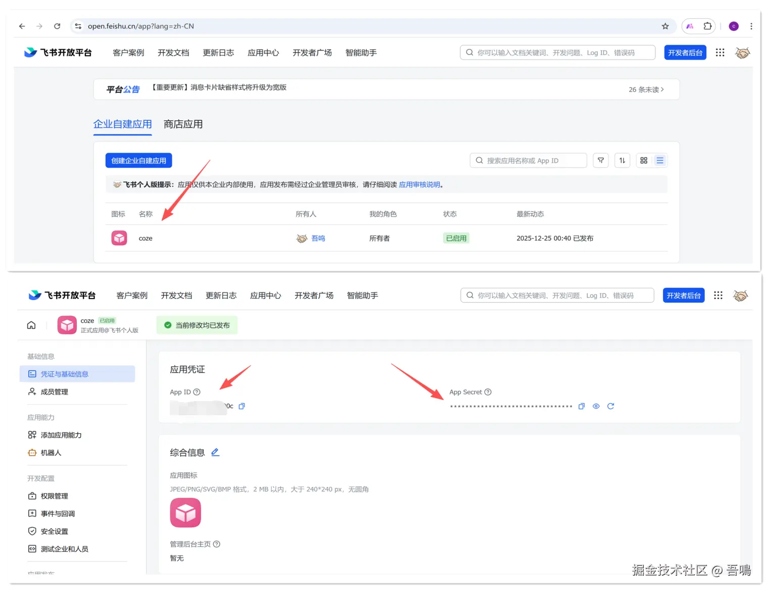 从飞书的开放平台进入到开发者后台(open.feishu.cn/app?lang=zh…),点击你的应用,进入到应用详情页即可获取。