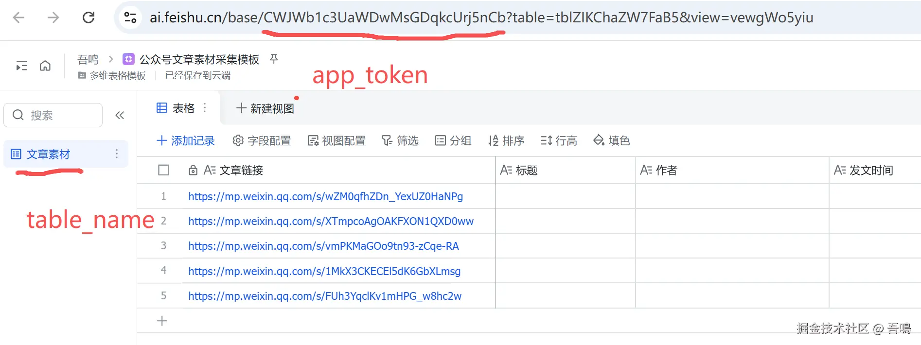 点击多维表格,进入到详情页,点击一张数据表,app_token和table_name就是如我下图这样获取,复制到对应的参数上即可。