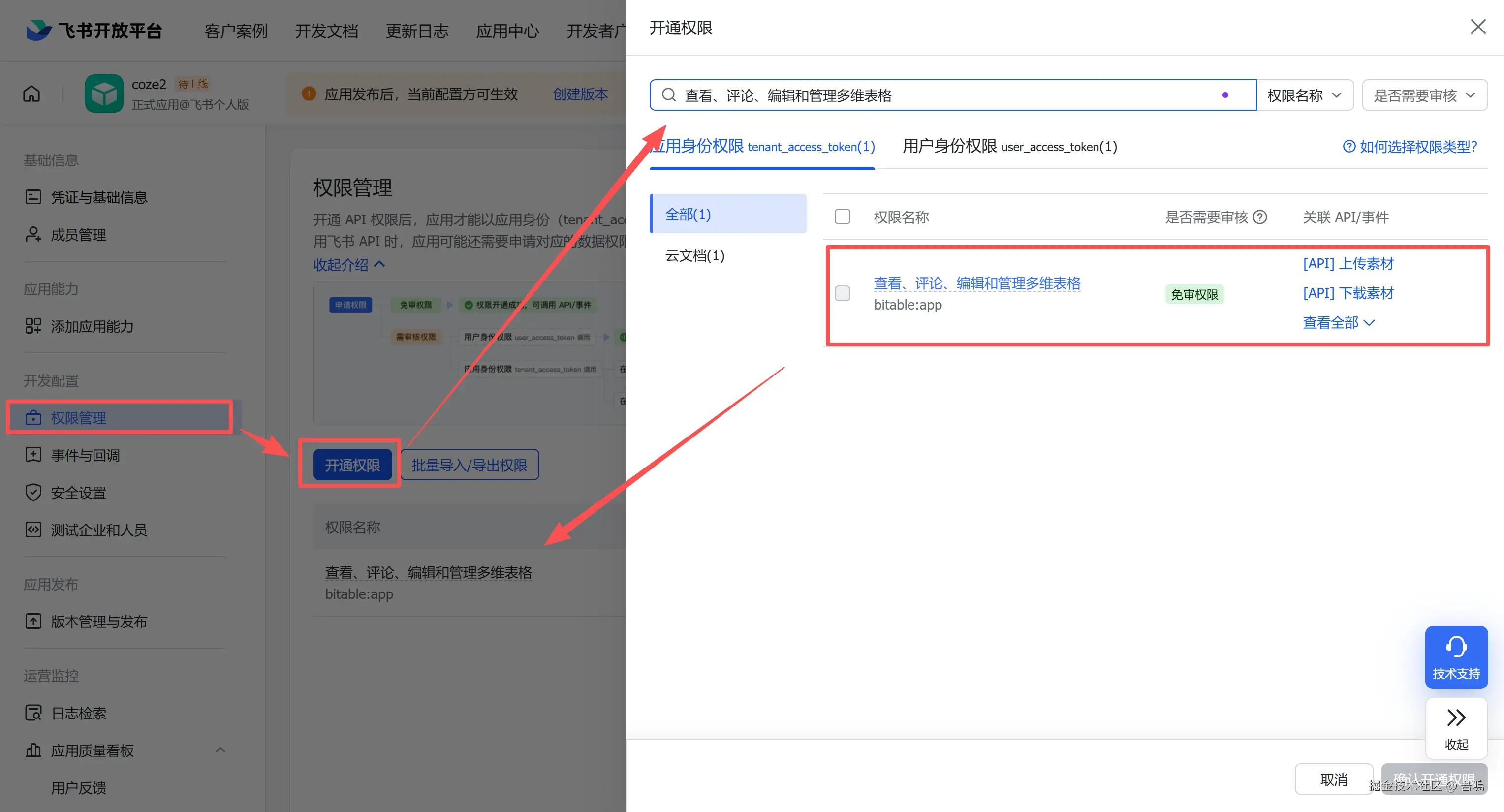 进入到应用详情页,点击应用详情页左侧菜单栏的“权限管理”中,点击“开通权限”按钮,选择“查看、评论、编辑和管理多维表格”这个权限。