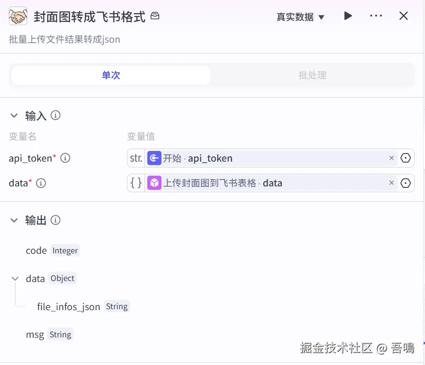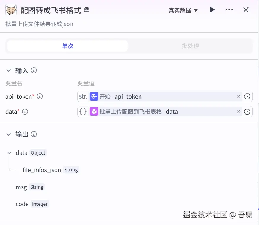 这个节点是将配图上传到飞书表格后的结果转成后面飞书表格可以理解的格式,使用到了扣子三方插件【飞书工具箱】的【upload_files_result_to_json】工具。