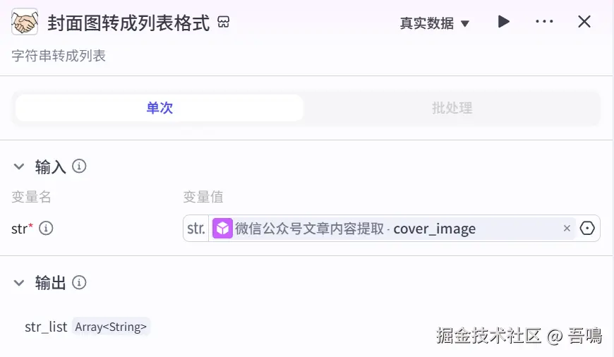 因为上传图片到飞书表格的插件只能接收列表,封面图只是单个,所以需要这个工具做转化,使用到了扣子三方插件【字符串工具合集】的【str_2_list】工具。