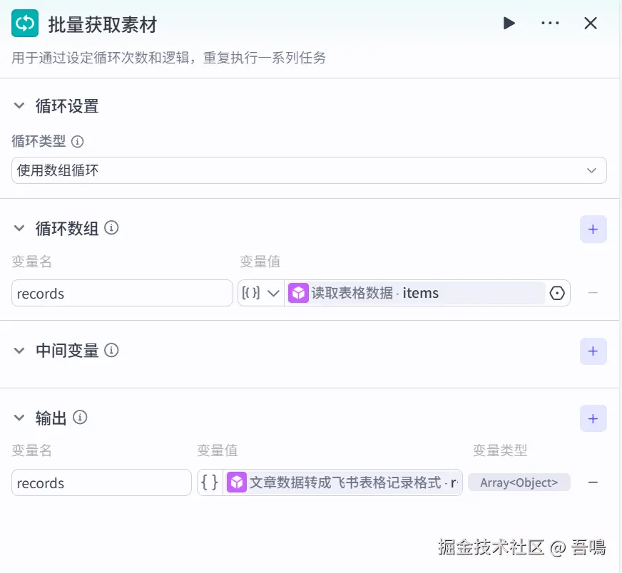 这个节点用来循环的获取文章的内容,使用到了扣子官方的循环节点。