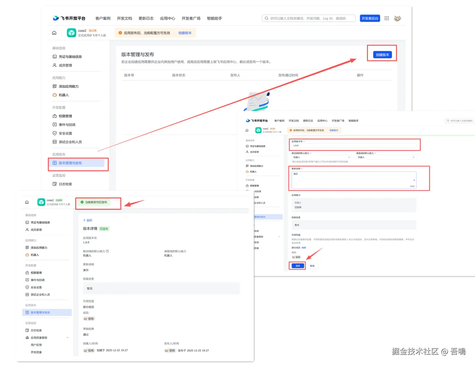 在左侧菜单栏点击“版本管理与发布”,点击“创建版本”按钮,填写信息发布即可。
