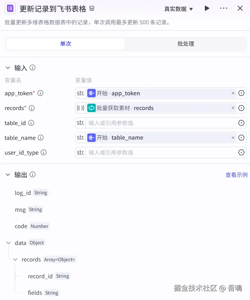 6、文章数据写入数据表:把已经转好格式的记录数据,通过使用飞书多维表格写入记录的接口把记录都写入到数据表中。