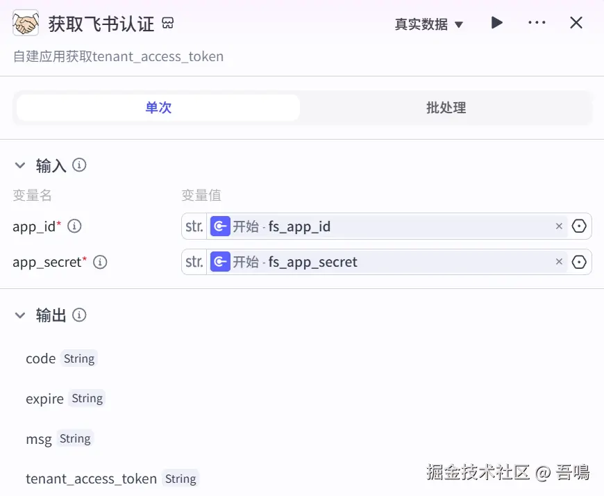 这个节点用来获取飞书多维表格接口认证,便于流程后面的接口调用,使用到了扣子三方插件【飞书工具箱】的【tenant_access_token】工具。