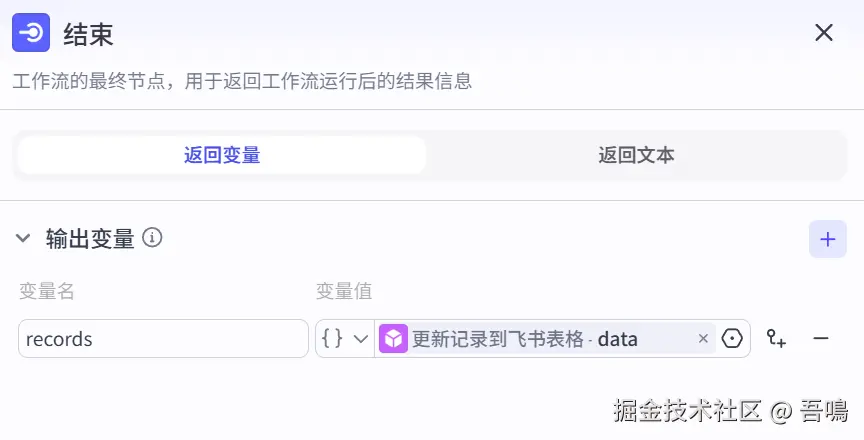 这个节点就是把前面节点整理好的内容写入到飞书表格中,使用到了扣子官方的插件【飞书多维表格】的【add_records】工具。