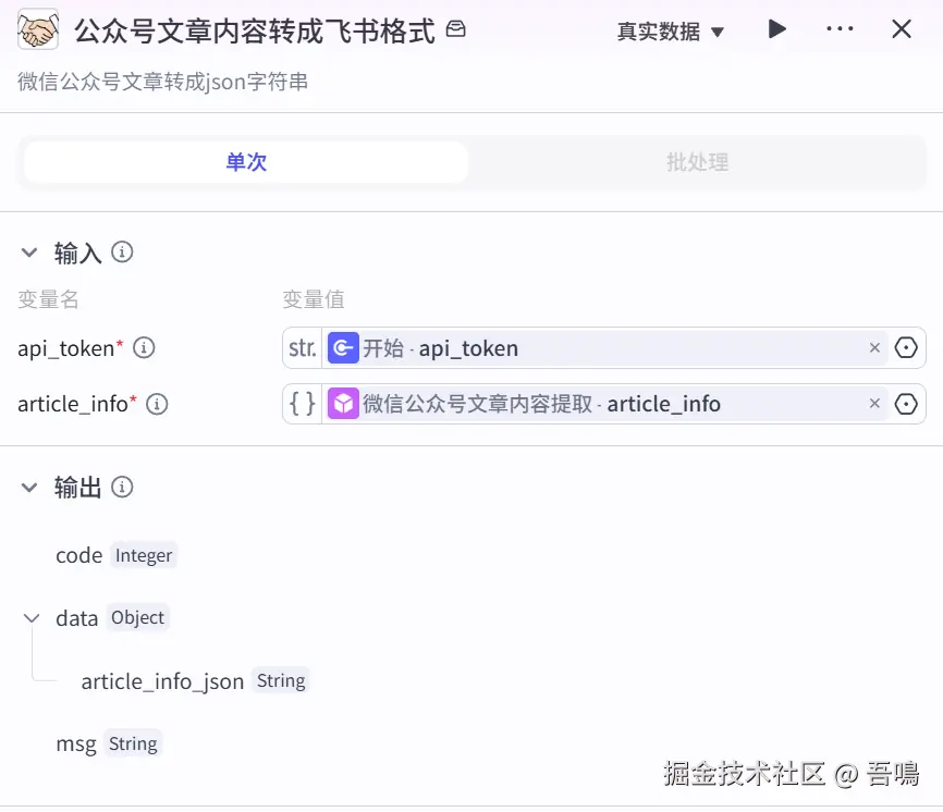 这个节点是把获取到的文章内容转成飞书格式,使用到了扣子三方插件【公众号文章信息提取】的【wechat_article_info_to_json】工具。