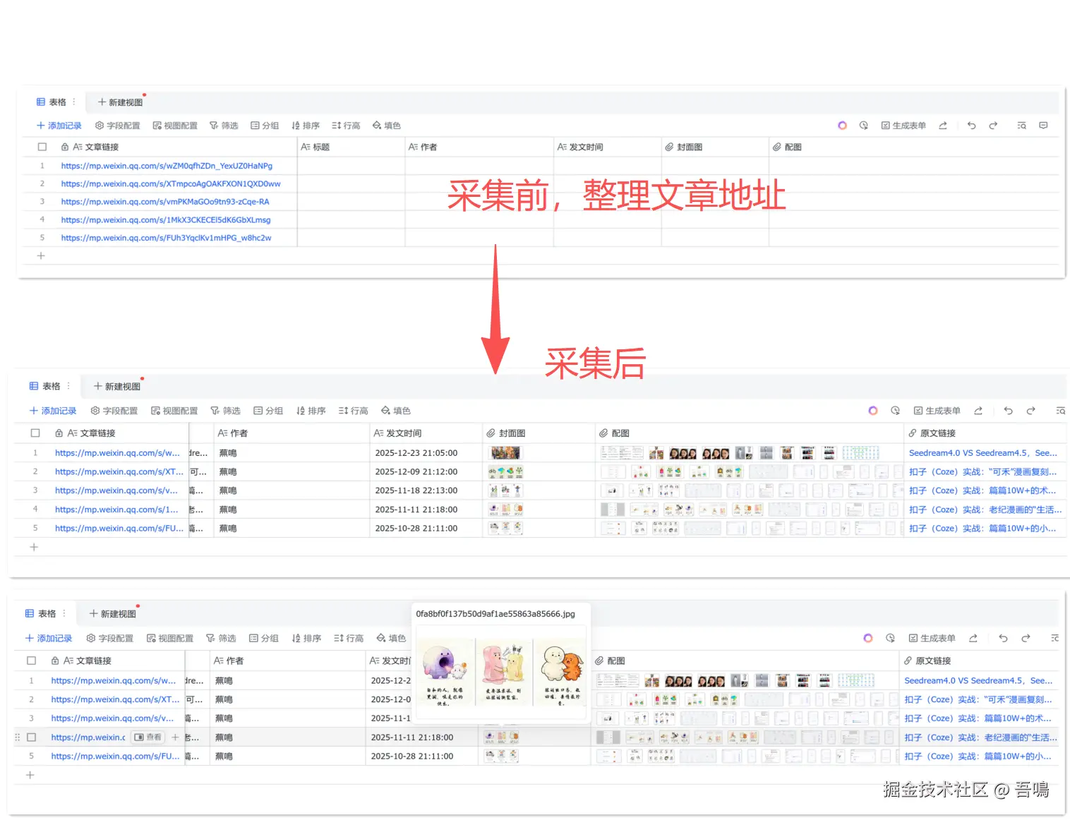 1、读取文章链接:首先会先从飞书表格中读取你整理出来的文章链接。